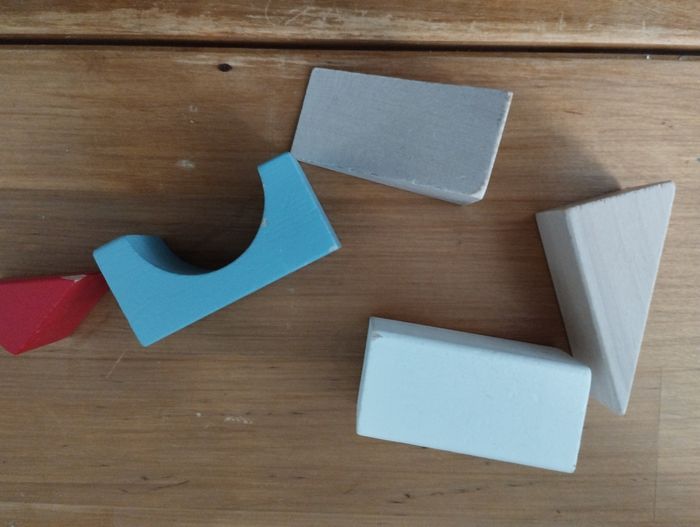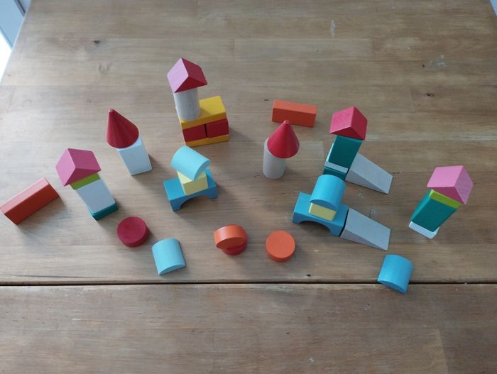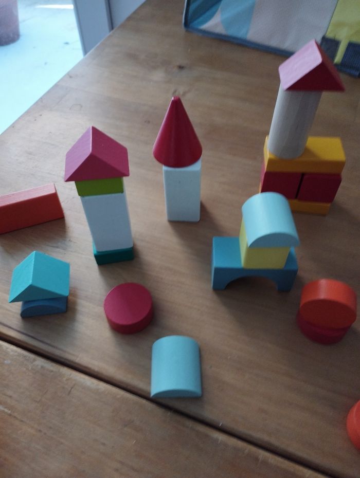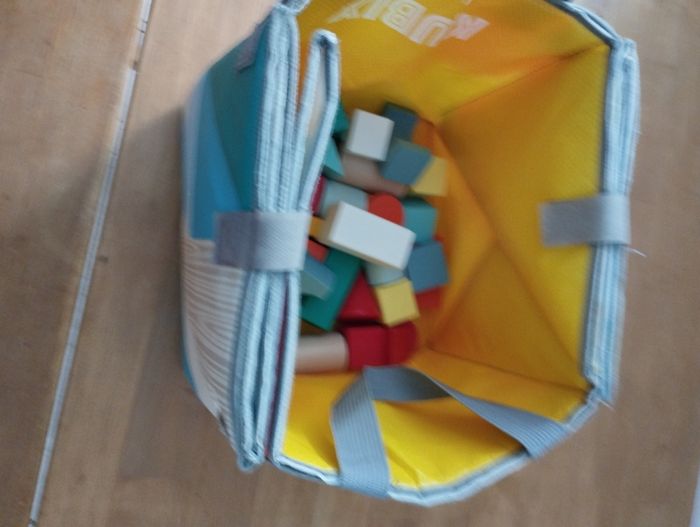 Set kubix 40 cubes de construction en bois de la marque Janod. Utilisés un peu mais comme nous avons ce jouet en double nous avons décidé de n'en garder qu'un seul . Le tapis est OK et les 40 cubes sont présents et je les ai nettoyé avant de faire les photos. Certains cubes ont la peinture qui est parfois un peu abîmée (cf photos), mais en règle générale la peinture est plutôt résistante.