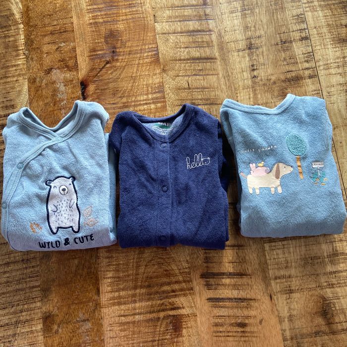 Le lot de pyjama est en bon état mais a été porté plusieurs fois. Les couleurs sont dans les déclinaisons de bleu. Taille : 63 à 69 cm pour les bébés de 6 mois