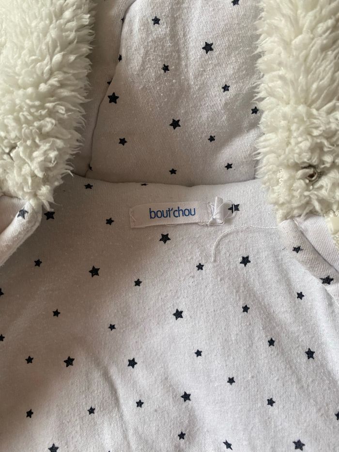 Combinaison blanche en très bon état. Très peu servi. Possibilité de détacher les mains pour les laisser libre Marque boutchou Taille 3 mois