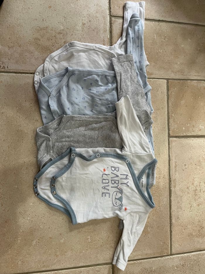 Lots de quatre body bébé en très bon état, taille 1 mois -Un de marque Pat & Ripaton, tissu super résistant je l’adore ! C’est un 3 mois selon l’étiquette mais correspond à un mois. Tissu doux au toucher - in absorba, bleu, parfait état - un kiabi, gris en parfait état - un In extenso, blanc, parfait état