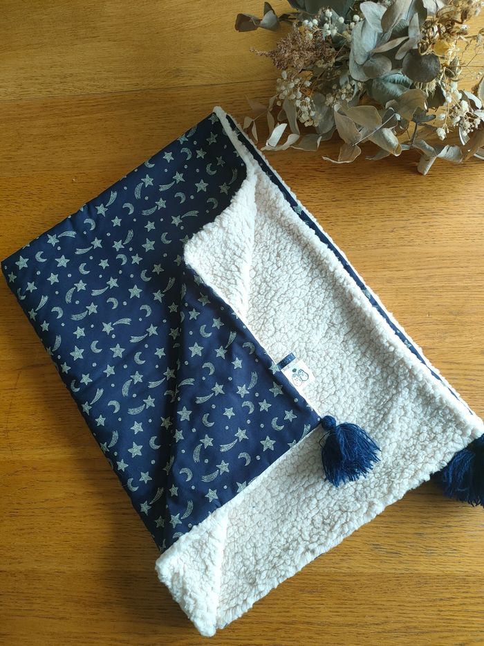 Idéale pour envelopper Bébé dans un cocon de douceur, ou pour poser sur la poussette ou le cosy. Réalisée en coton marine avec des petits motifs étoiles et lune, et doudou sherpa, elle est toute douce et légère, tout en restant chaude. Dimensions : environ 70x96 cm