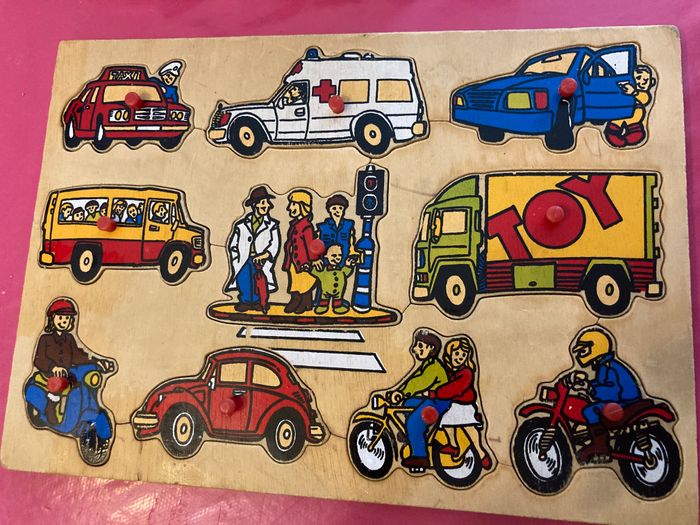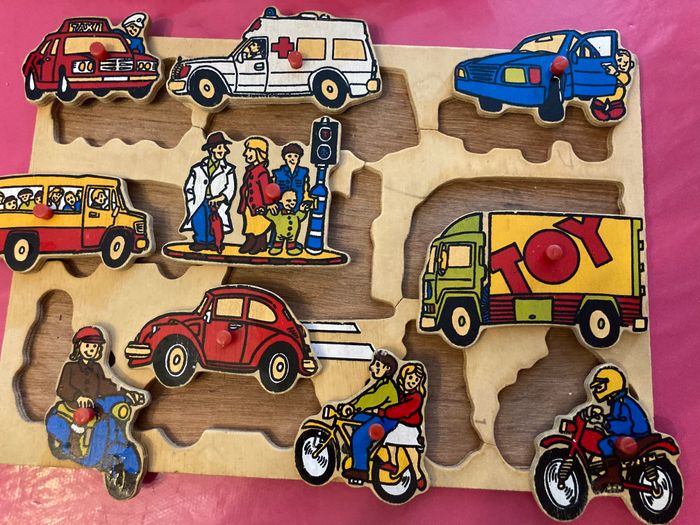 Puzzle encastrement en bois vintage Années 80 Thème les modes de transport Complet en très bon état néanmoins il a été manipulé par des enfants Non négociable Envoi rapide et soigné