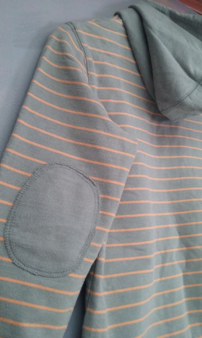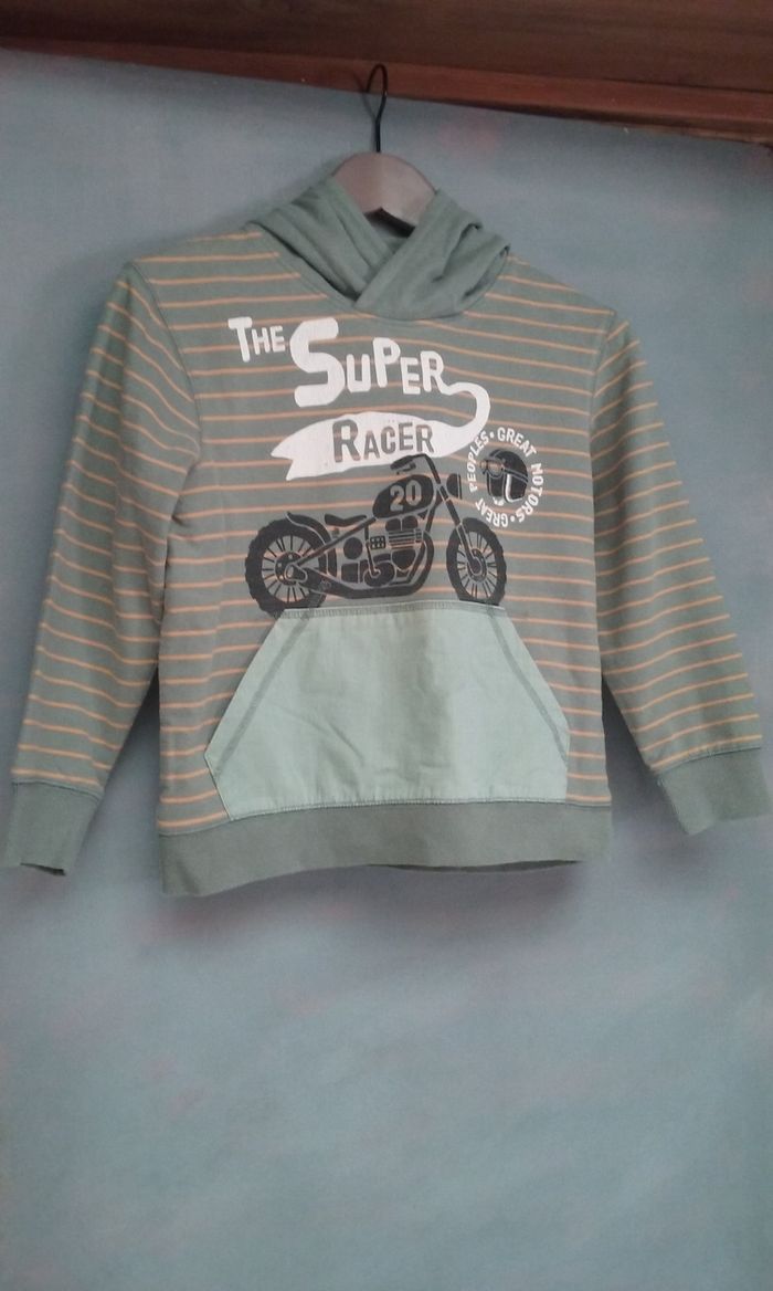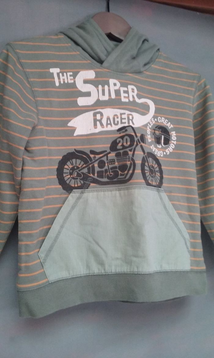 Sweat à capuche, poche centrale, vert et rayures jaunes.