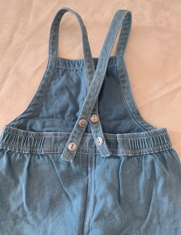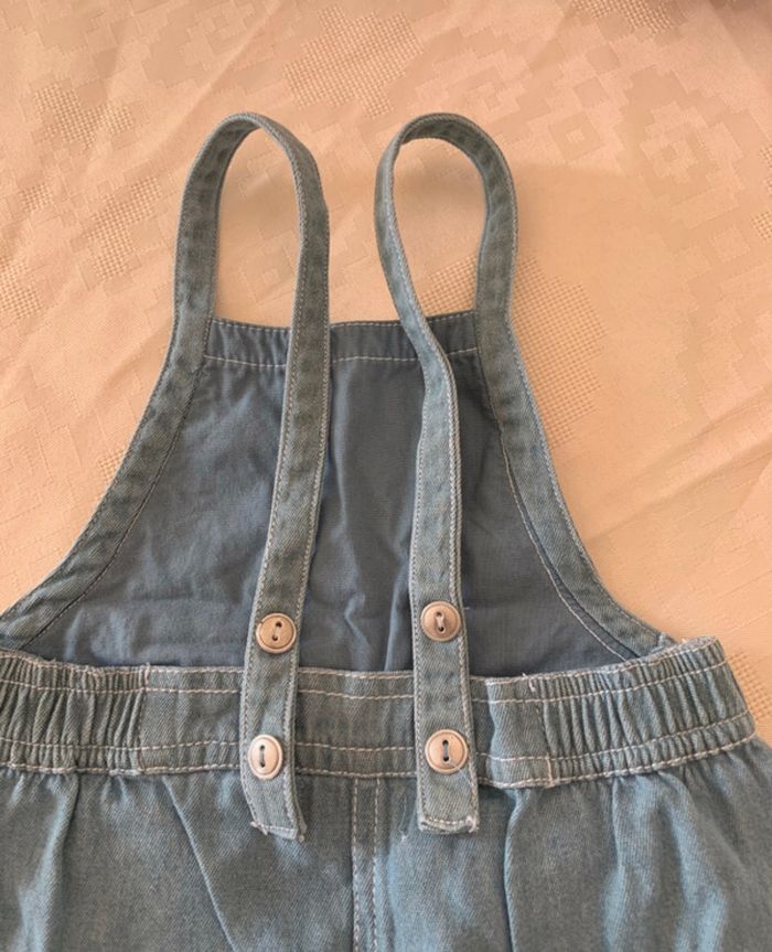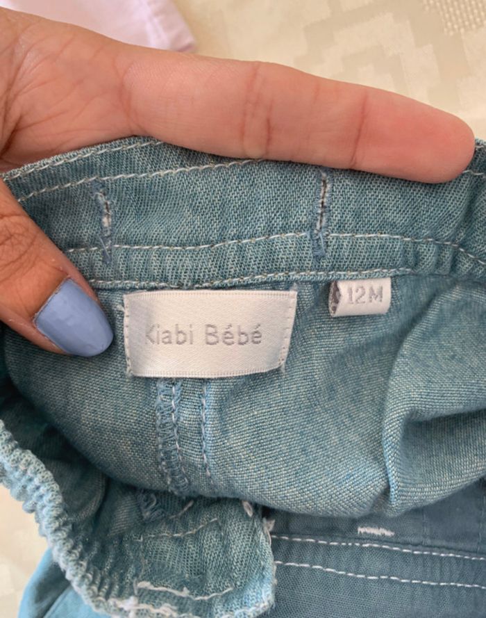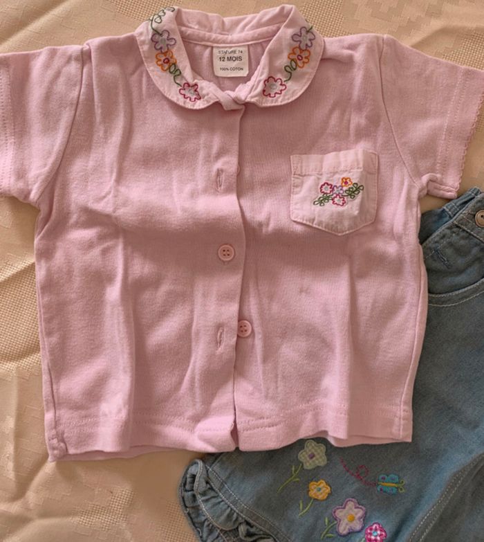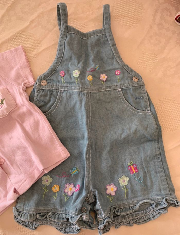Lot combishort en jean Kiabi à fleurs Kiabi et t-shirt manches courtes rose à fleurs. Possibilité d'attacher de différentes façons voir photos 4 &5. Taille 12mois et en très bon état.