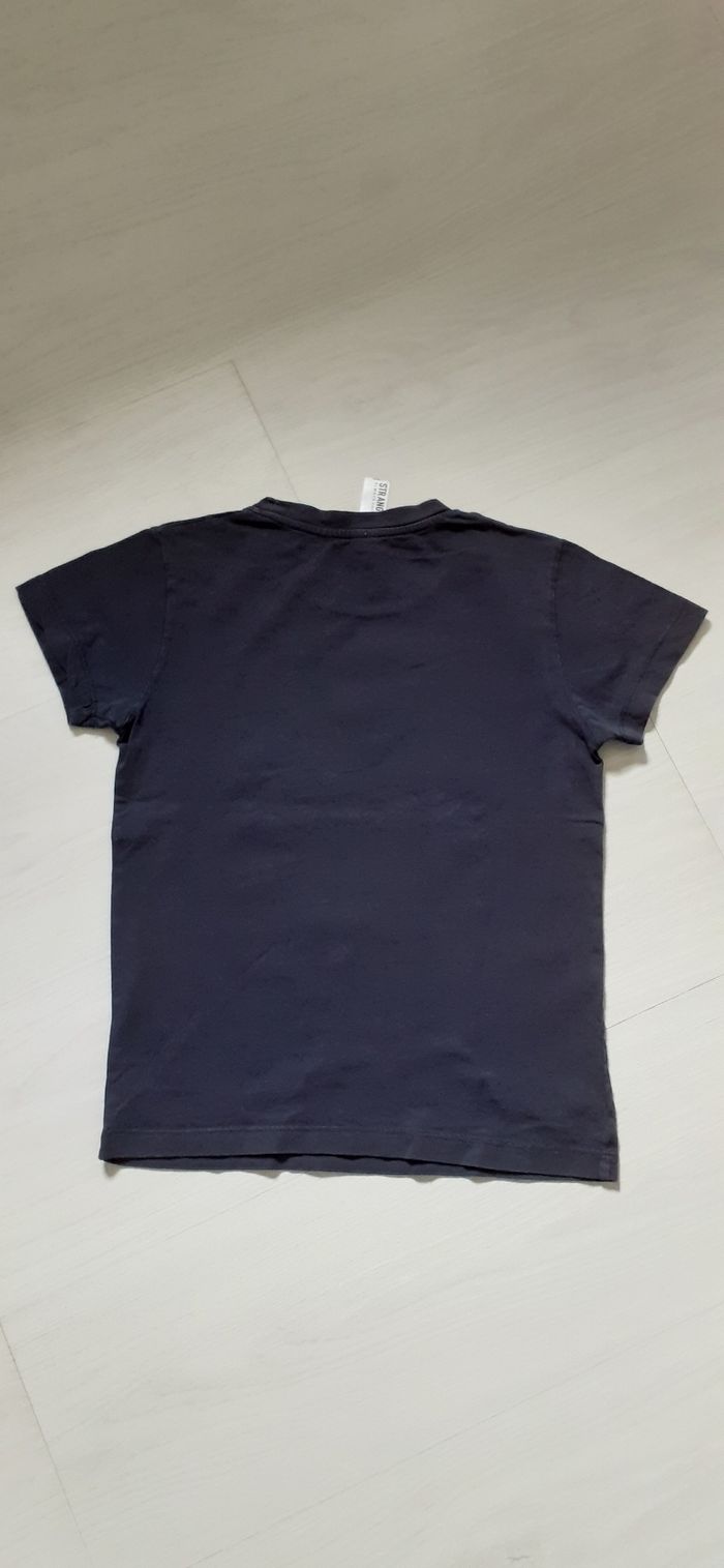 Tee-shir T 7/8 ans Marque STRANG Couleur bleu marine et motif blanc devant Manches courtes 100 %coton Très très bon état