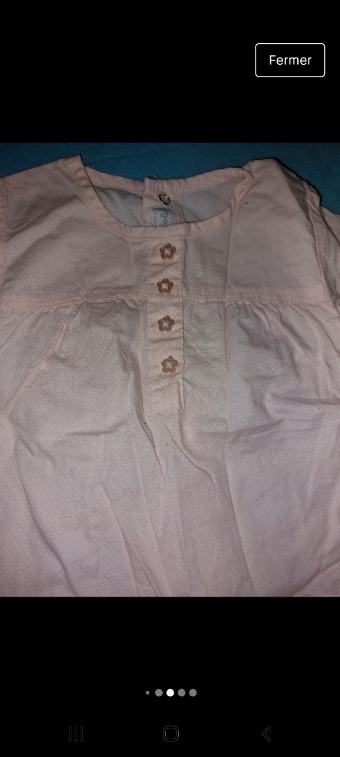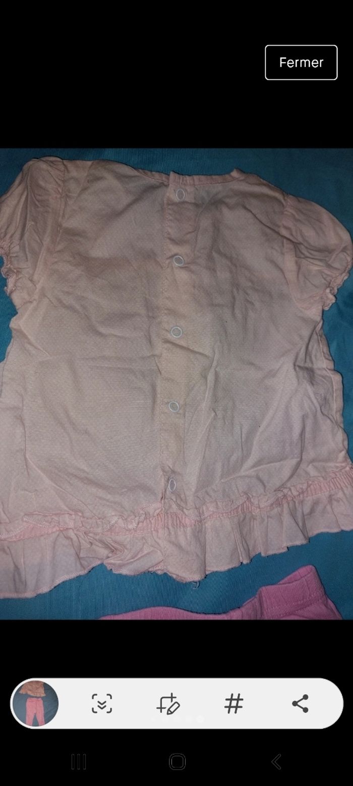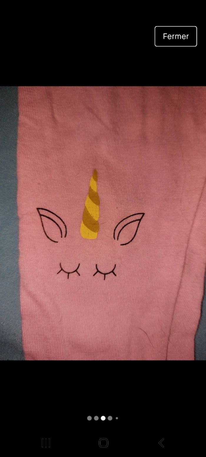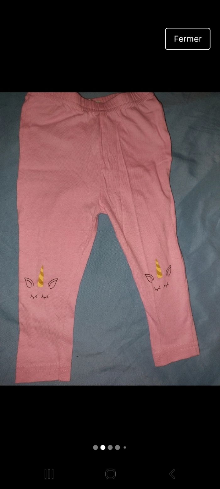 - 1 haut style chemisier manche courte Déjà Porté. Couleur rose claire. Marque petit kimbaloo. Ouverture dans tout le dos par bouton pression. - 1 legging rose avec dessin petite licorne. Taille élastique