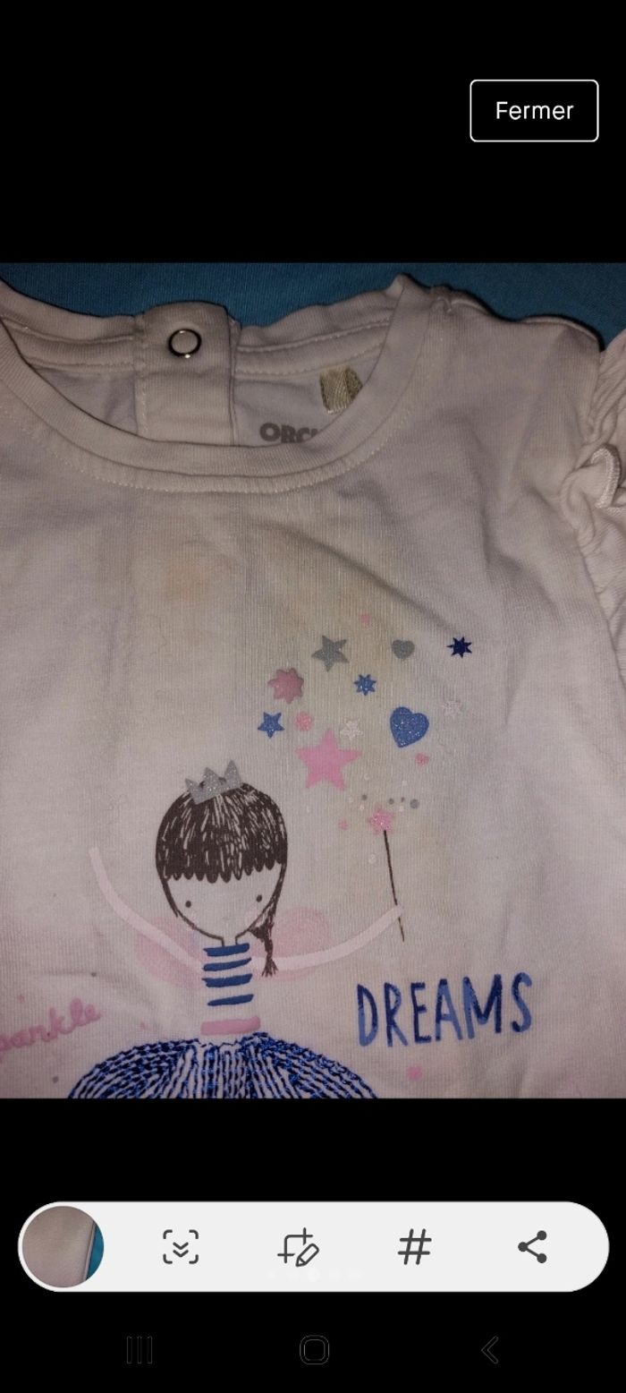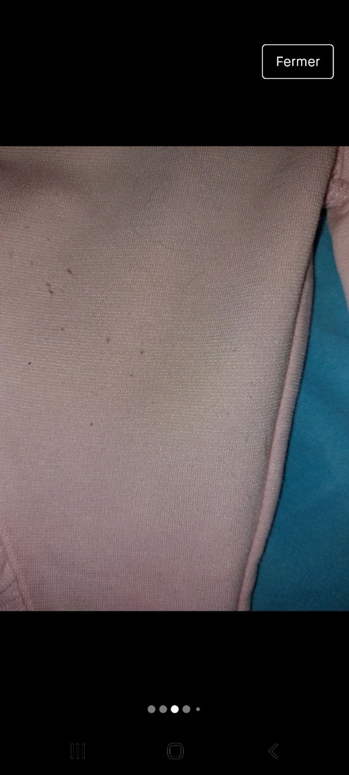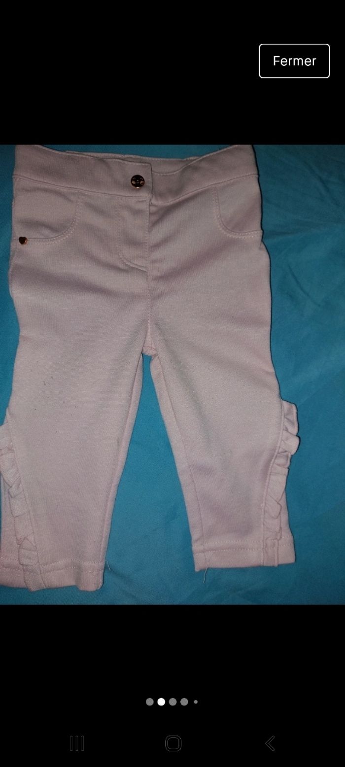 Taille 9 mois - 1 jolie pantalon rose. tissus un peut abîmé par les lavages. Etat satisfaisant tache ou pression abîmé voir photo. Souvent porté. - Haut blanc avec effet "froufrou" sur les devant. Dessin petite fée (blanc rose clair et bleu jean) ouverture par 3 boutons pression dans le dos. Taché sur le devant, à voir au lavage.