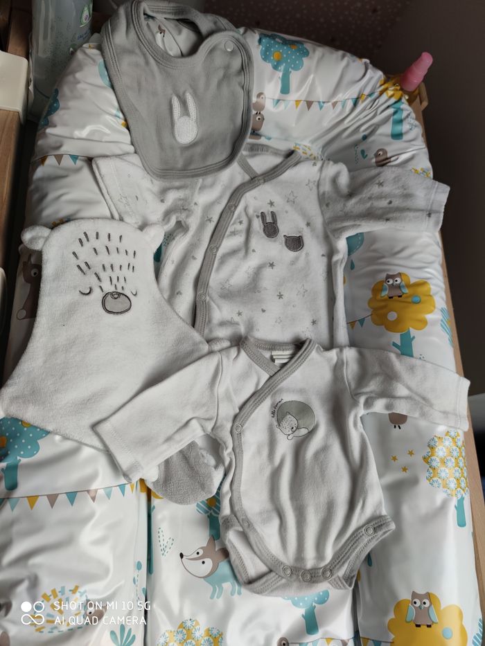 Ensemble qui comprends pyjama body bavoir et petit doudou Taille 1 mois En parfait etat une micro tache voir photo