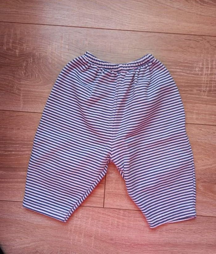Pantalon 6 mois rayé bleu en très bon état avec une taille élastique pantalon molletonné coton polyester très bien pour les soirées fraîches
