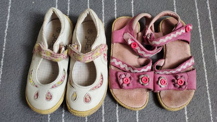 Ballerines blanche et fleurie 26 et sandales roses 27.