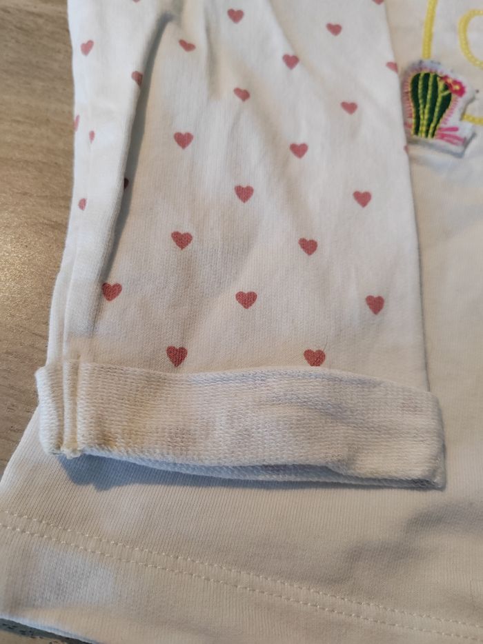 Pull et 4 ans blanc avec motif cœur sur les manches et perroquet et fruit sur le devant. Petit tache quasi invisible sur manche (cf photo)
