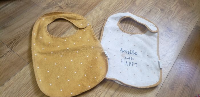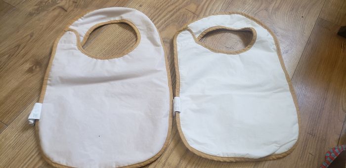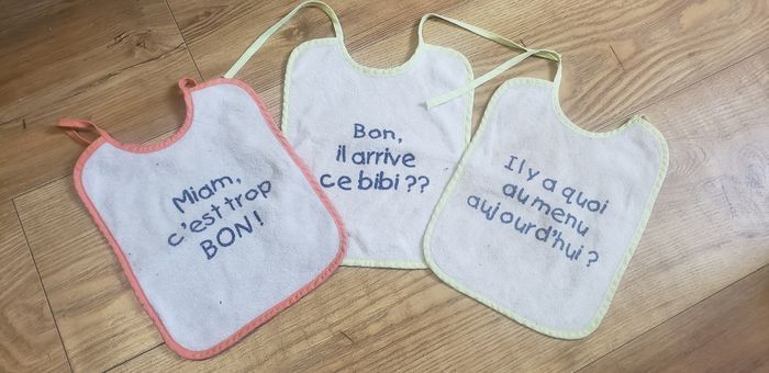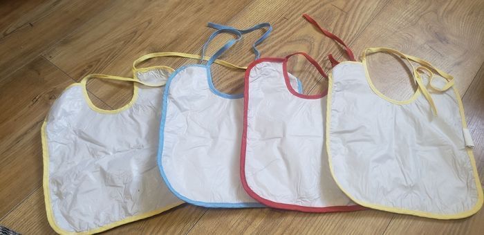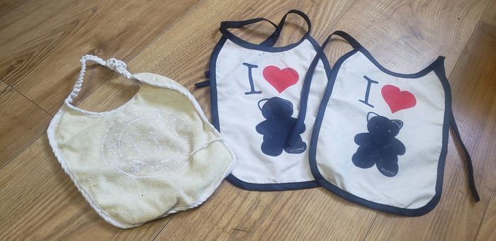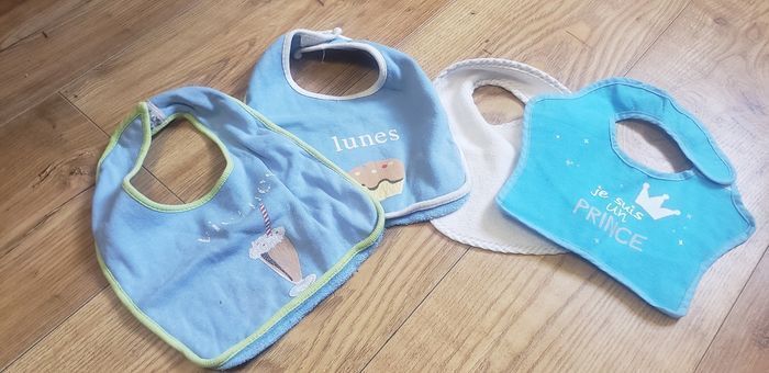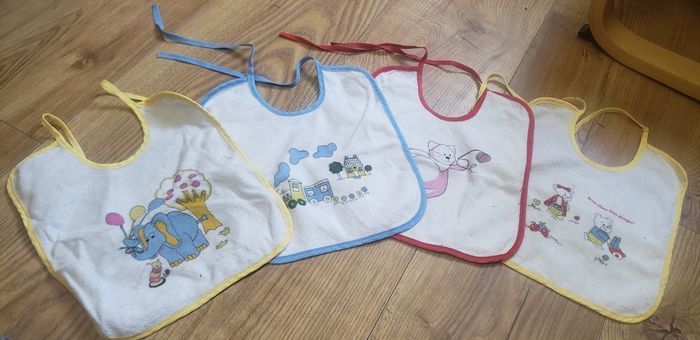 Certains a scratchs, d'autres à attacher. Neufs pour certains, d'autres en bon état. Matière coton pour les uns et plastifiés pour les autres. Ont encore de beaux jours devant eux