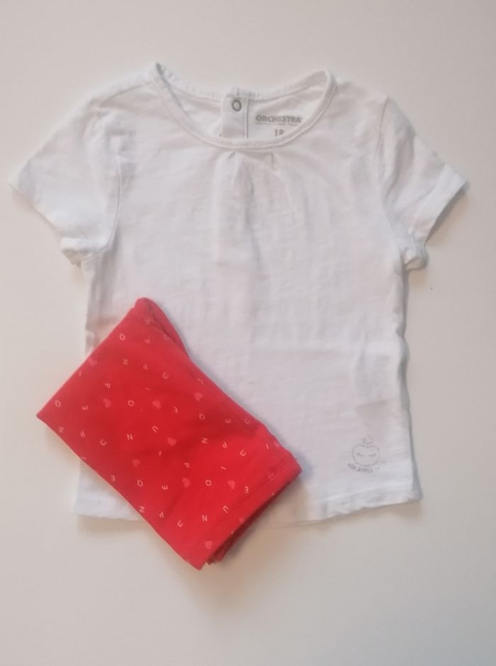 Ensemble fille été 18mois. T. Shirts Manche courte orchestra. 81cm 100%coton. Legging rouge grain de blé 80cm. 94%coton. 6%elasthane. Porté une fois. 6€