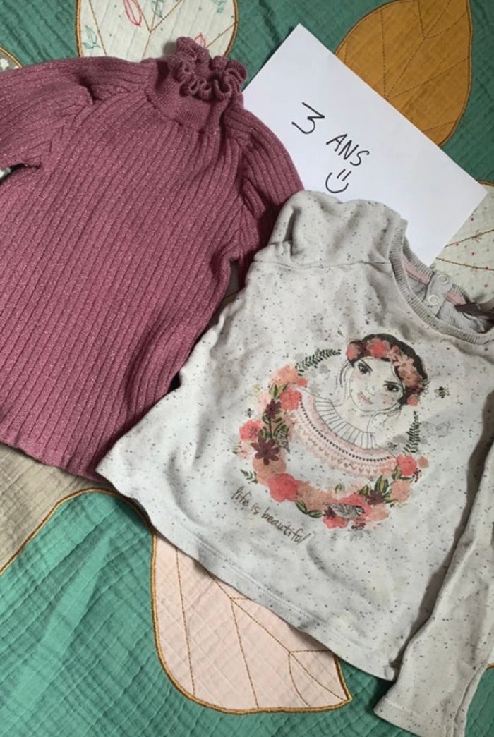 2 jolie petit pull mi saison Le violet foncer est un peu pailleté, taille super bien Marque Orchestra et Tape à l’œil Taille 24 mois