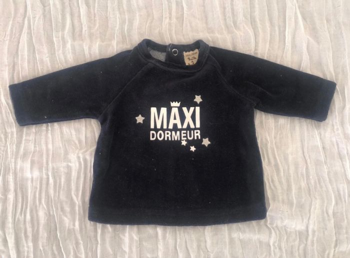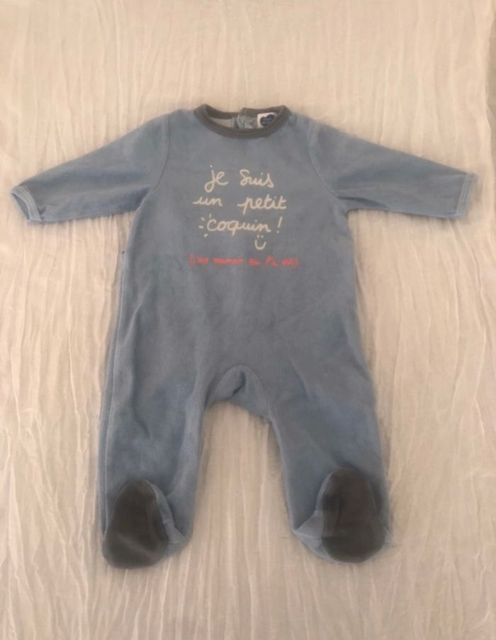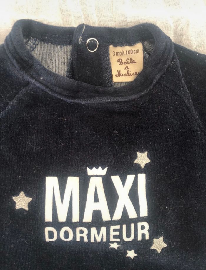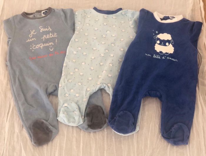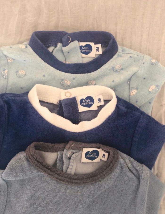 Lot vêtements 3 mois se compose : bleu gris 3 pyjamas molletonnés « mots d’enfants » 1 pull « boîte à malice »