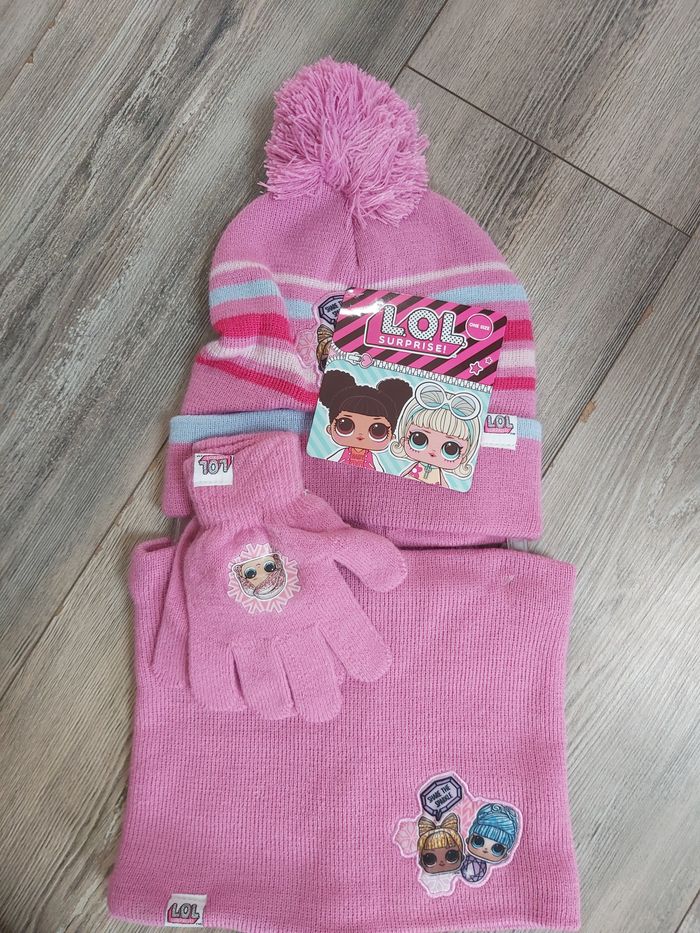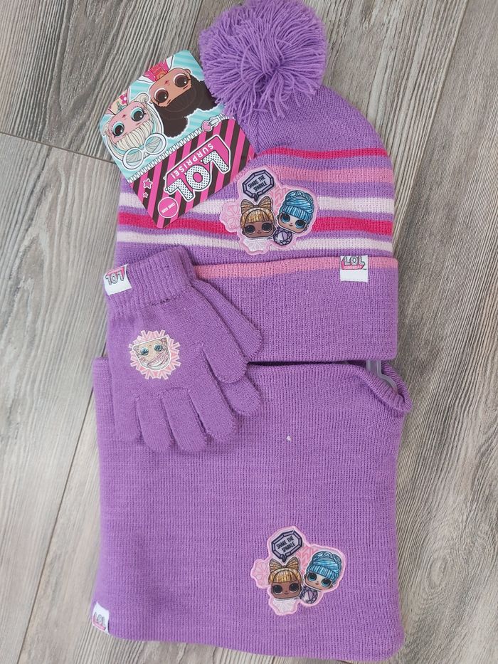 Vends ensemble LOL 3 pièces bonnet cache cou et gant 12€ pieces 52 a 54cm de périmètre crânien mais ça convient à ma fille et a moi-même donc peut allez jusqu'à un enfant de 8 9 ans