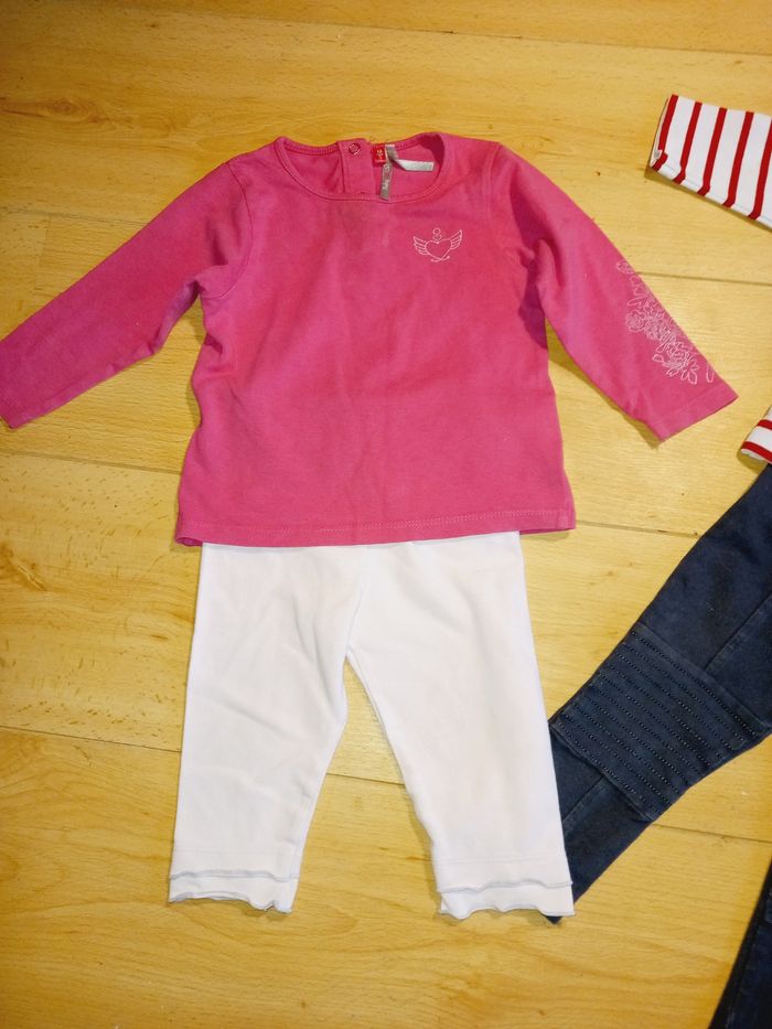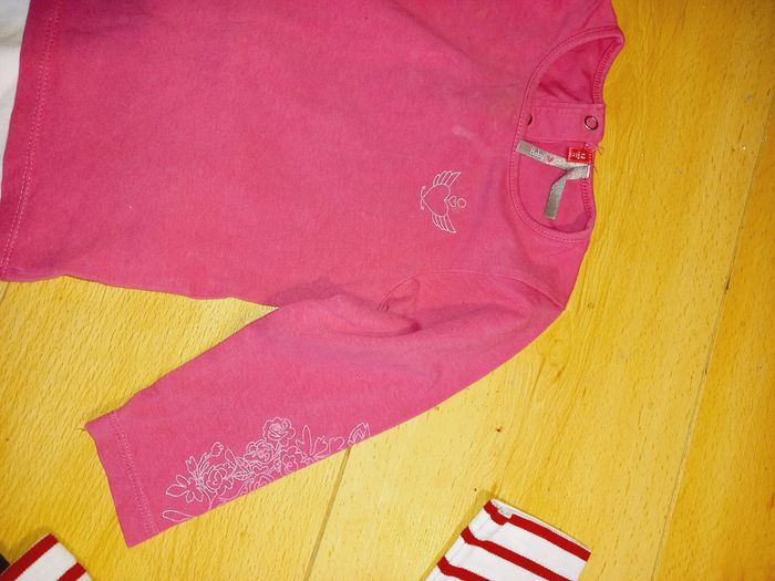 2 ensembles 12 mois , un rose fushia 74cm et 1 avec haut blanc ligne rouge plus tregging gris 80cm
