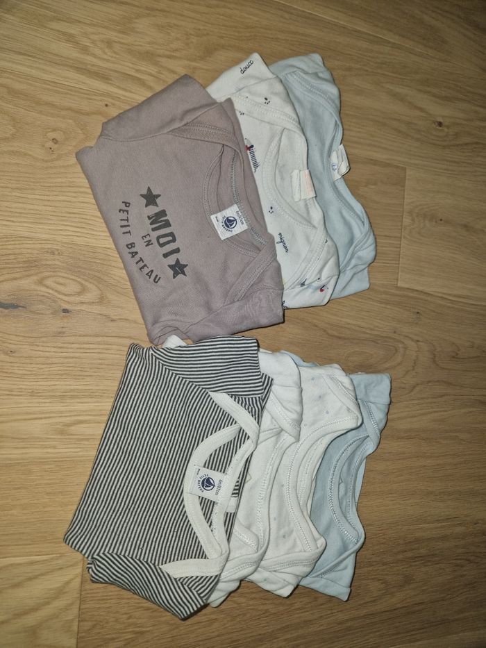Le lot de bodies manches longues comprends: 2 bodies Petit bateau 2 bodies absorba 3 bodies TeX En excellent état Taille 6 mois