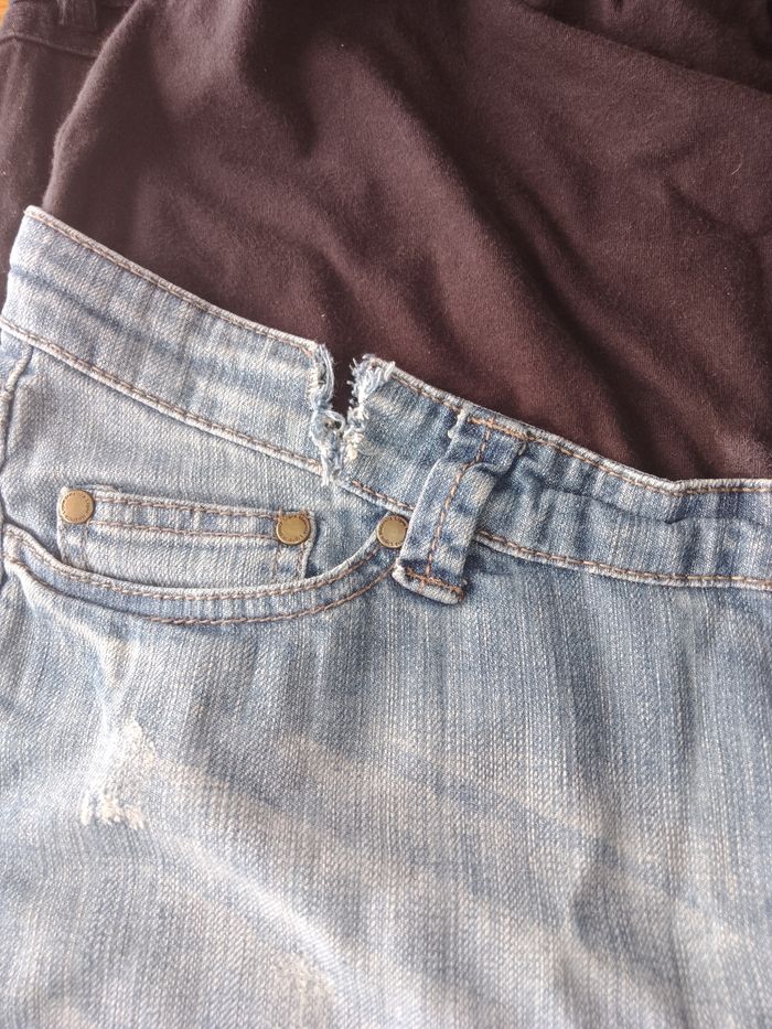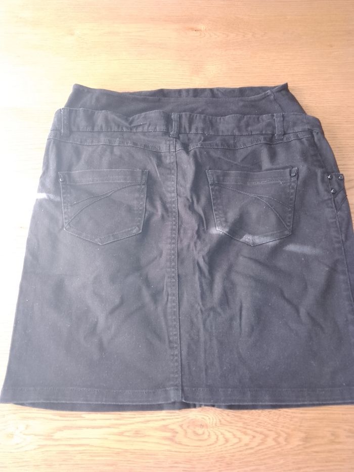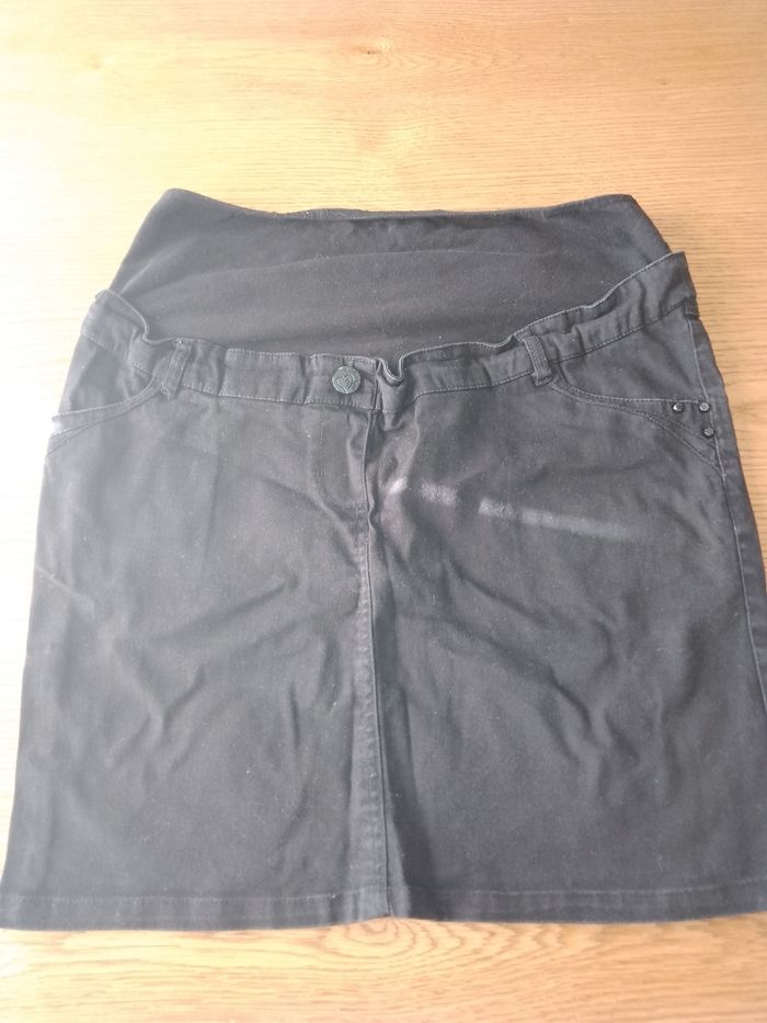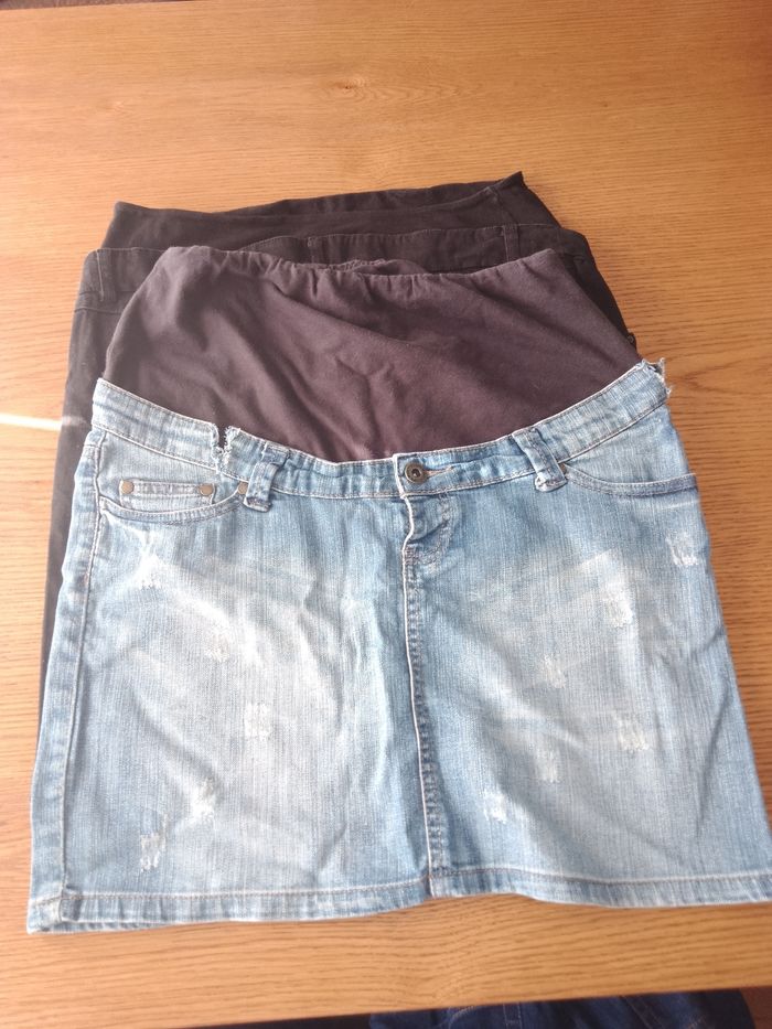 Bonjour je vends une jupe noire de grossesse taille 40 bon état avec je donne une jupe bleue en jean de grossesse taille 40 j'avais craqué la taille car devenu trop petit craquer à deux endroits c'est pour ça que je le donne avec la noire