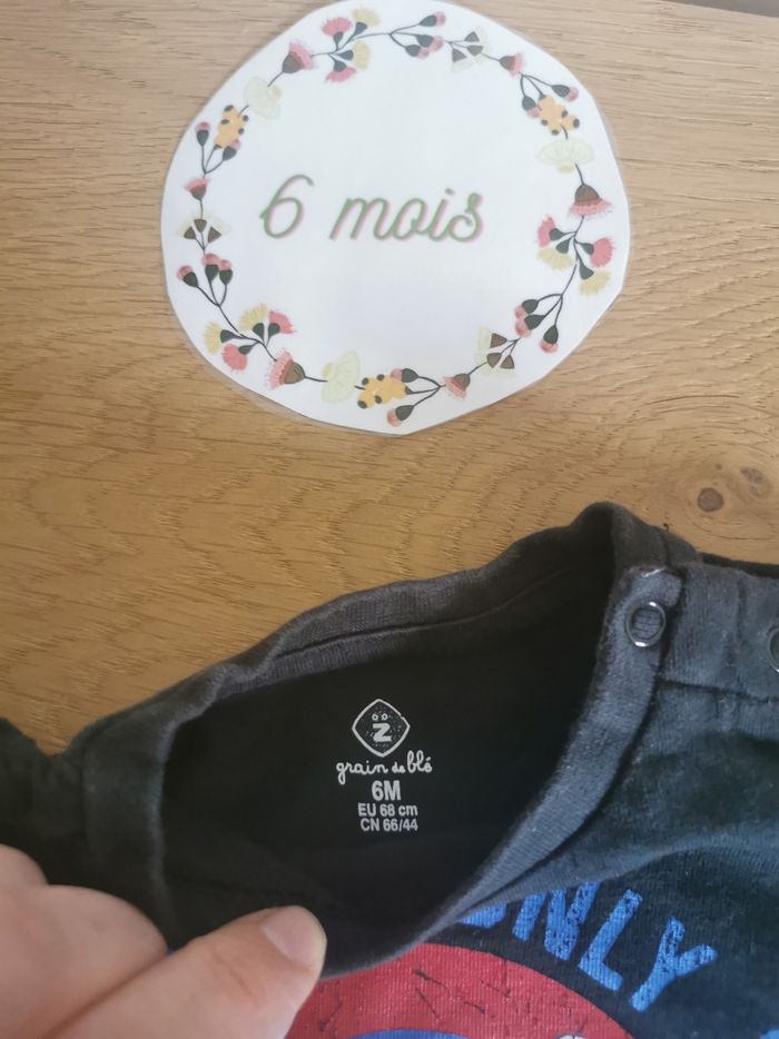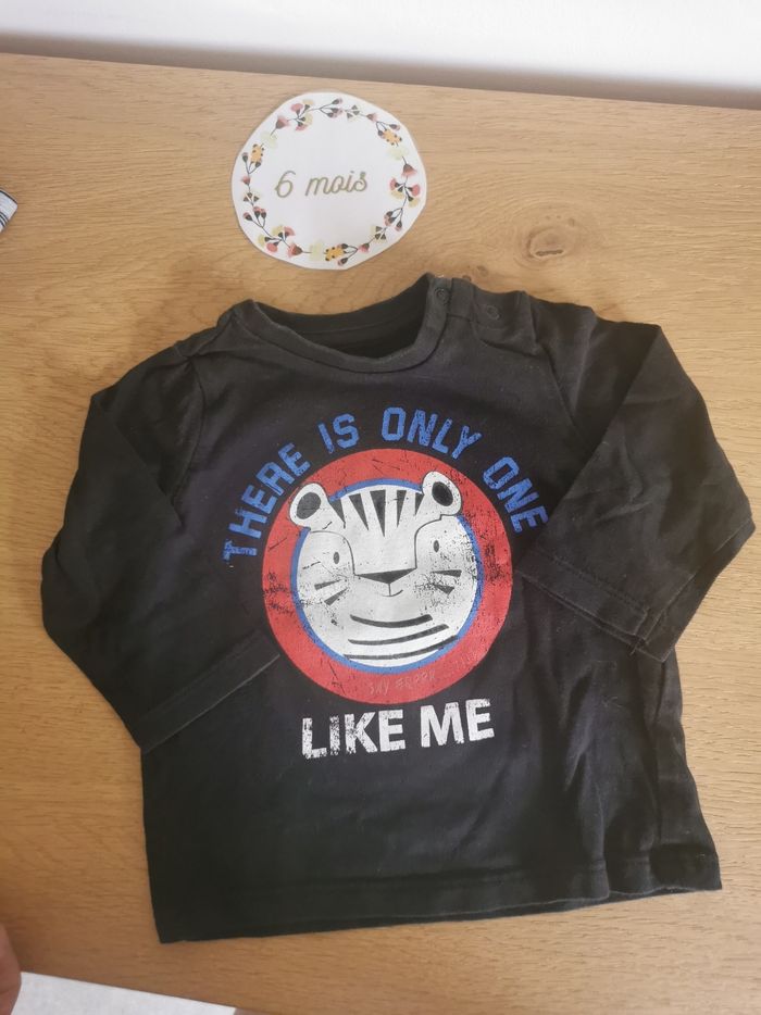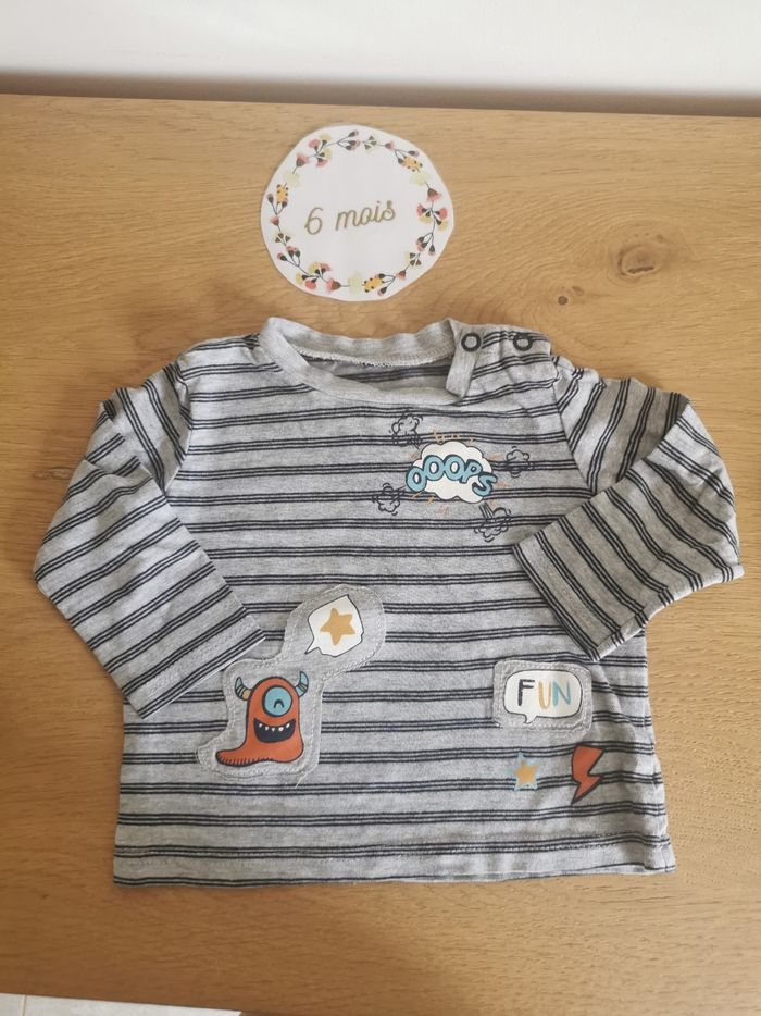 Lot de 2 t-shirts manches longues bébé 6 mois en très bon état ✅Tshirt à rayures in extenso très peu porté. Tamponné du prénom de l'enfant ✅T-shirt noir grain de blé très bon état