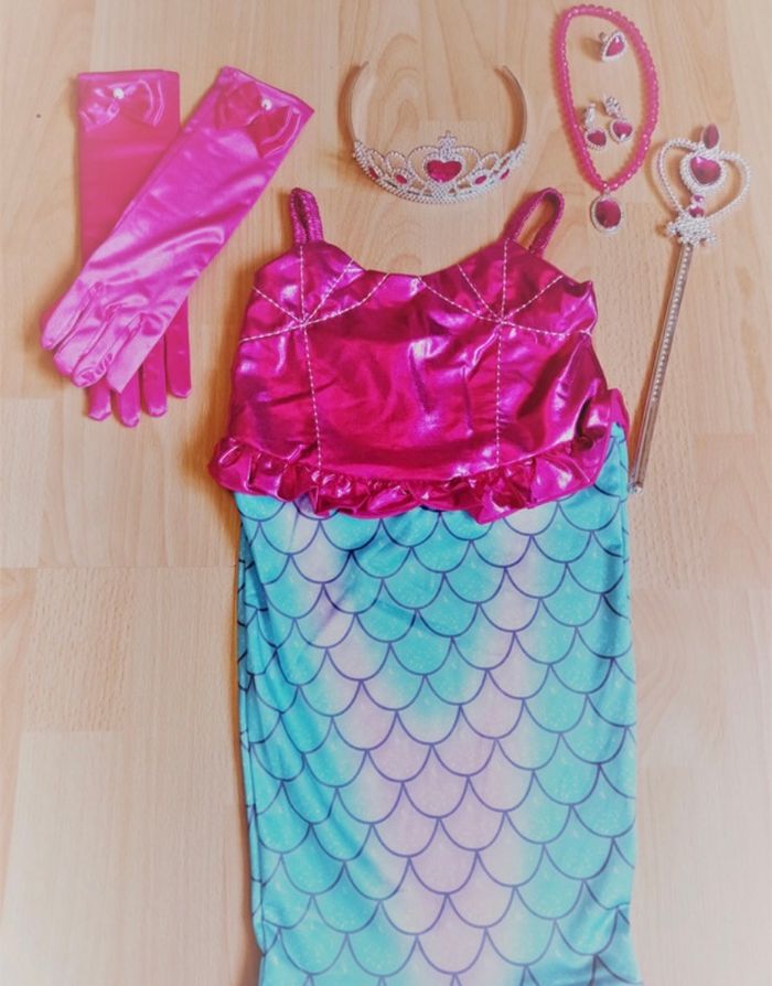 Déguisement sirène et accessoires (baguette, couronne, gants, bijoux). La taille convient aux petites filles de 4-5ans (longueur de la robe 75cm). Totalement neuve, vendue dans son emballage d’origine.