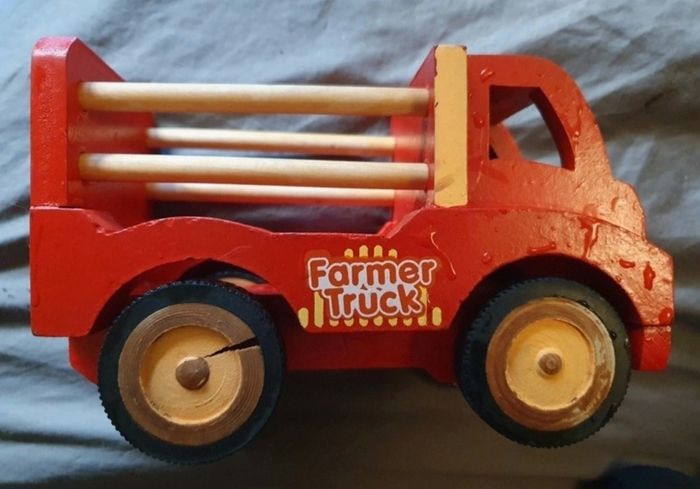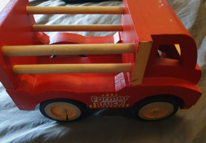 Camion Farmer Truck en bois Pneu en caoutchouc. Quelques tâches, devant, sur le dessus, et légèrement rayé etc...