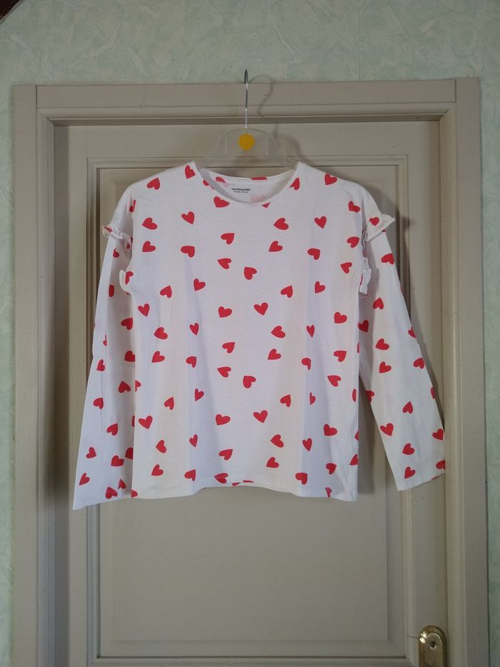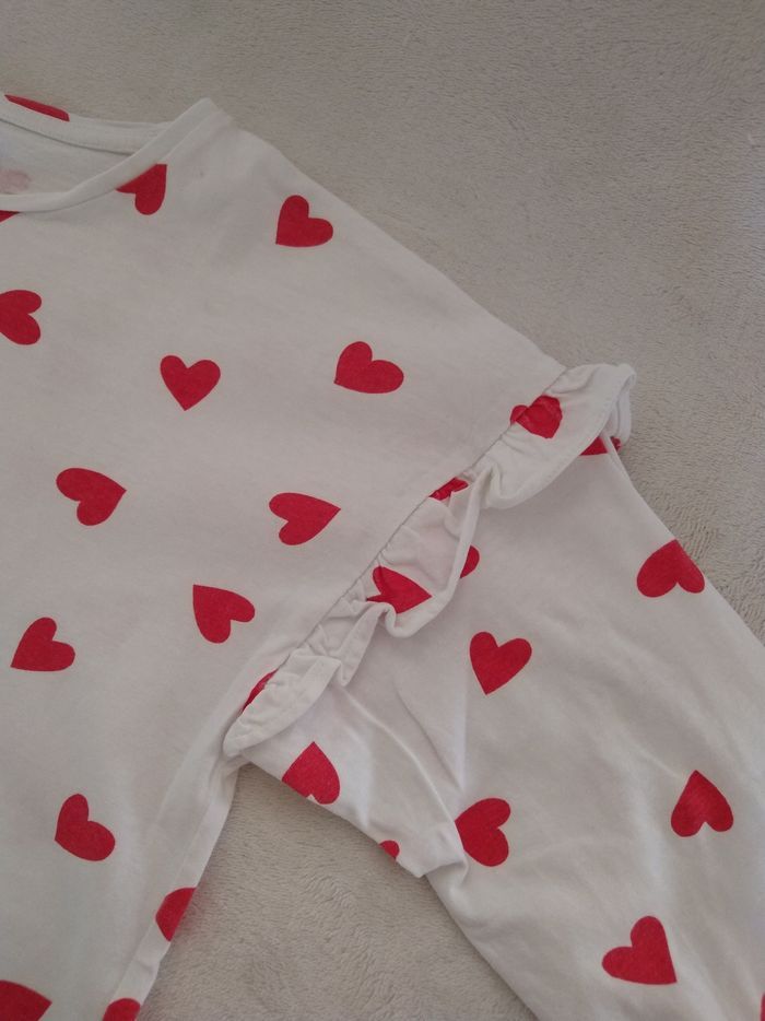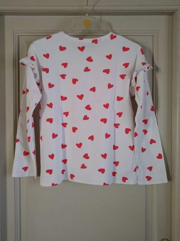 T-shirt/Haut de pyjama à manches longues Marque Vertbaudet Taille 14 ans, 158 cm • Coloris blanc, rouge • Imprimés cœurs • Volants aux manches • Tissu fin • Petite tache sur une manche En très bon état #evelyne_filles_14ans #evelyne_filles