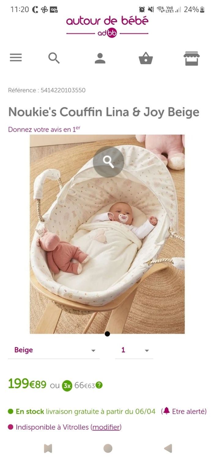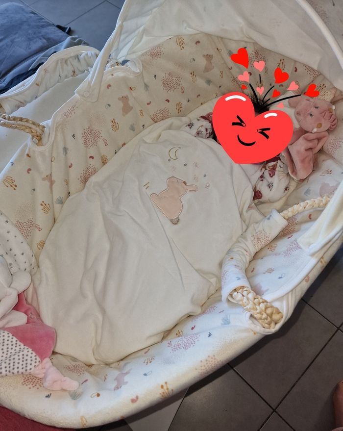 Vends couffin collection Lina et Joy de chez Noukies en très bon état acheté le 25.02.23 Je le vends car bébé grandit Très jolie couffin Je le vends avec son matelas, la petite couette et le pied. Maison non fumeur et très bien entretenu. Pas d'envoi. Je peux faire un effort sur le prix dans la limite du raisonnable. Merci pour votre compréhension