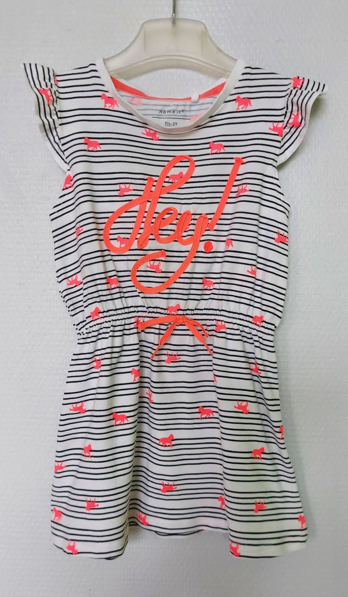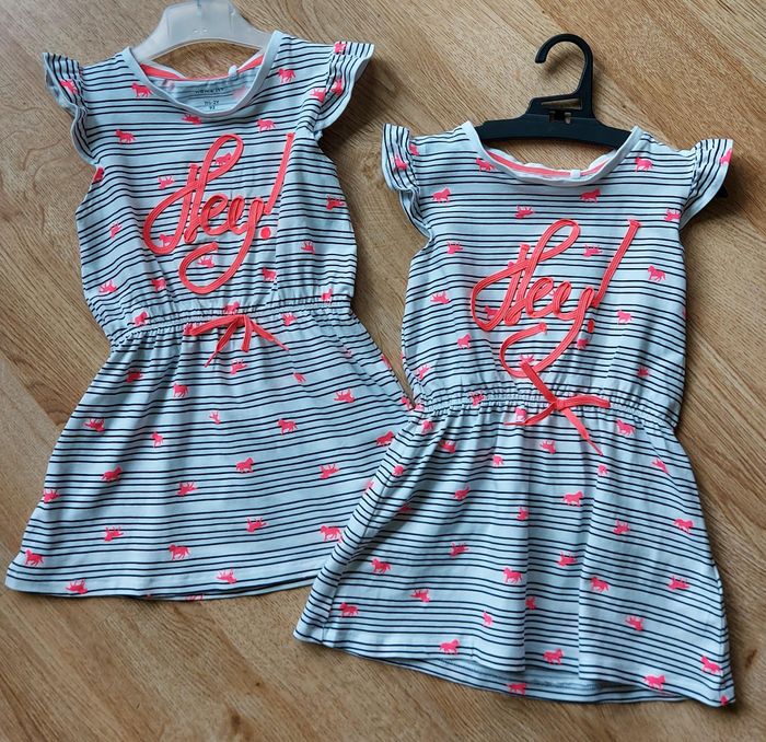Idéales pour des jumelles. Ces 2 robes identiques sont décontractées et très jolies portées ! Blanches à rayures noires avec motifs fluo Name-it taille 92 cm