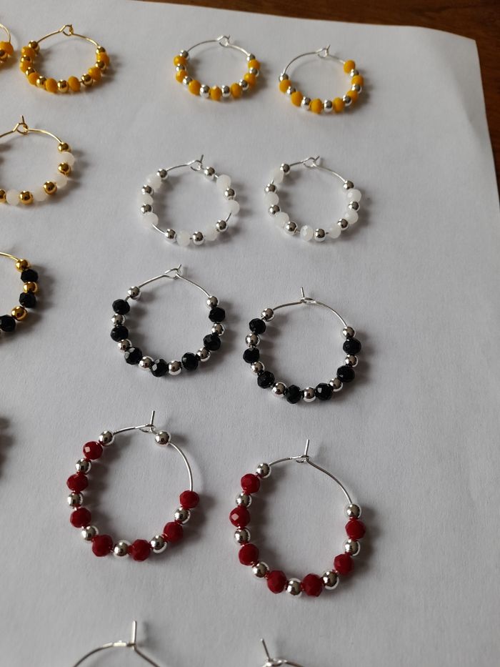 Boucles d'oreilles créoles en perles. Les anneaux mesurent 2,5cm. Choisir entre la couleur dorée et argentée. Les perles sont disponibles en différentes couleurs : jaune, blanc, noir, rouge, rose et bleu turquoise. Merci de préciser la couleur que vous souhaitez. Fait main ✋ par mes soins :) N'hésitez pas à me contacter pour toutes demandes complémentaires :)