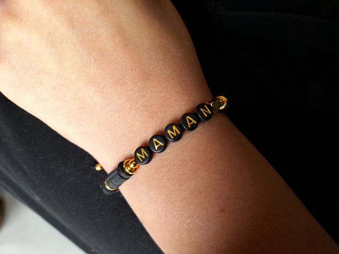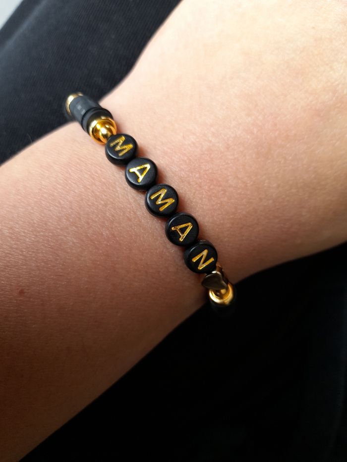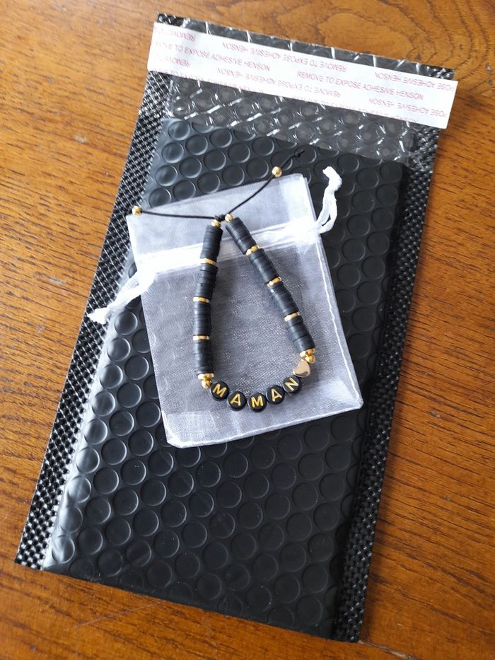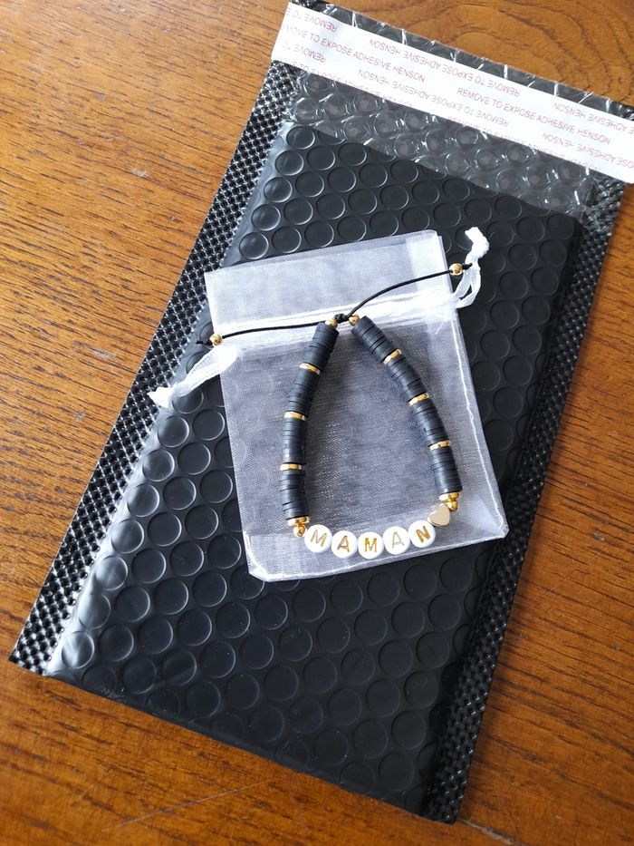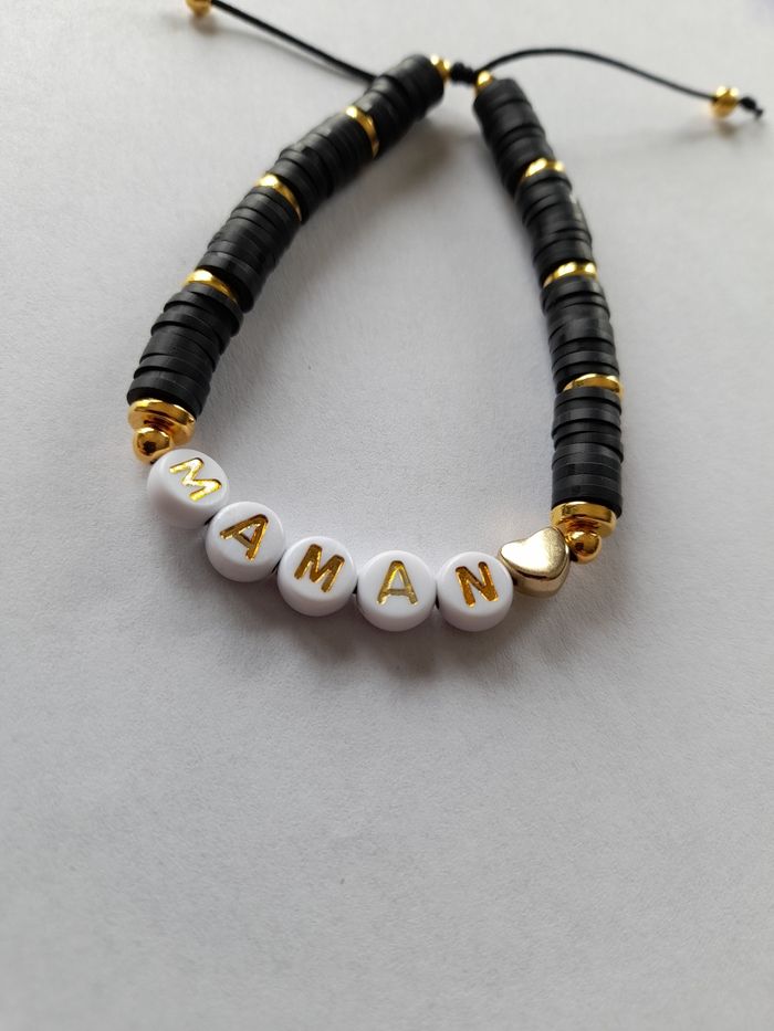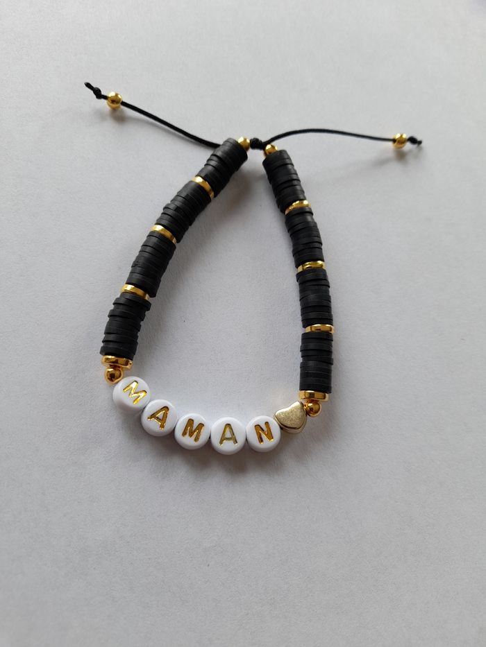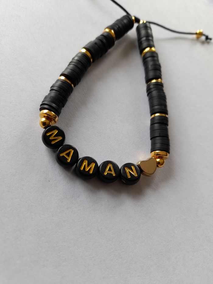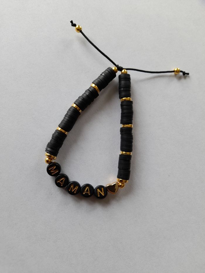 Bracelet en perles heishi 6mm de couleur noir avec perles d'espacement dorées. Les lettres du mot maman sont au choix: dorées sur fond blanc ou dorées sur fond noir. Le bracelet est réglable grâce à son nœud coulissant. Fait main ✋par mes soins :) N'hésitez pas à me contacter pour toutes demandes complémentaires ;)