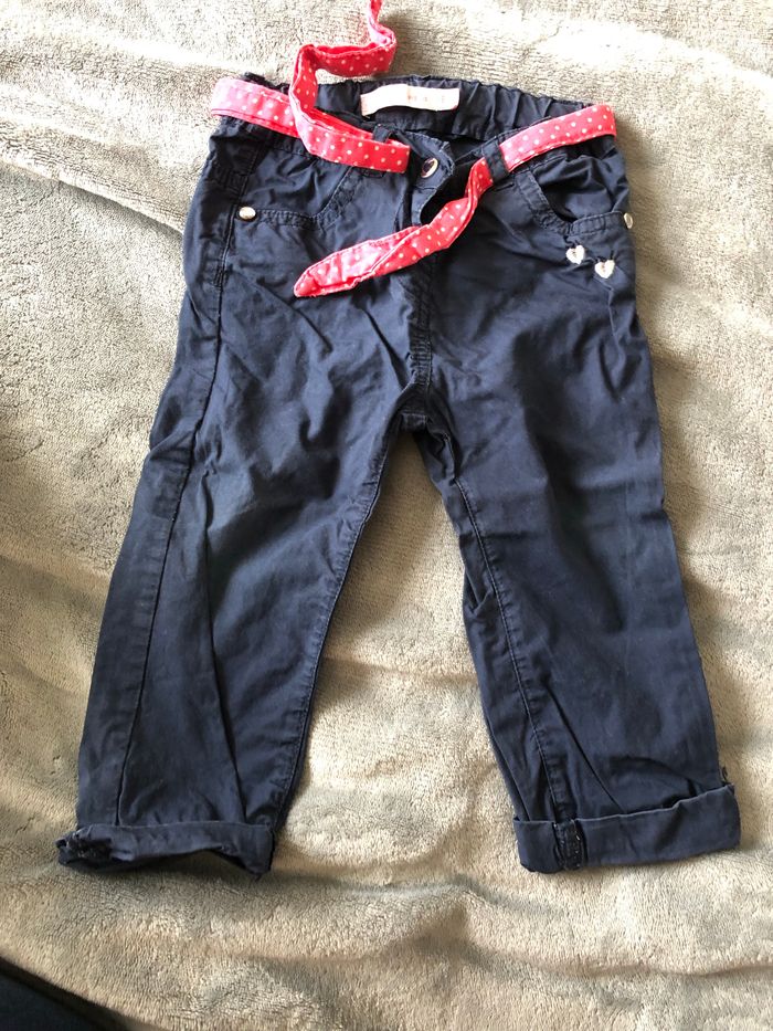 Adorable pantalon fin marine avec sa ceinture rose. Taille ajustable. Pantalon en très bon état. Taille 18 mois