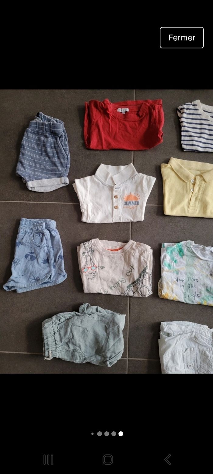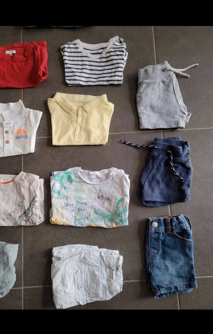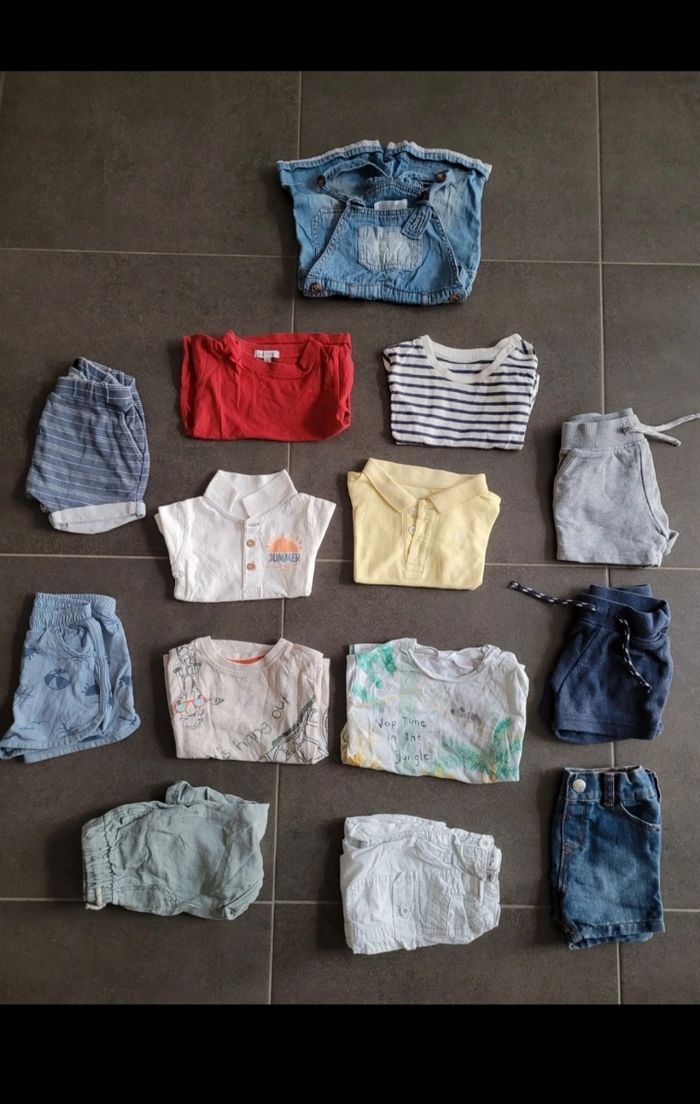 5 shorts, 1 salopette, 6 t-shirt manche courte , 2 pantalon léger 6 pyjamas léger 2 pyjama chaud 1 body 1 chemise , 5tshirts manche longue, 2 jeans , 2 salopettes , 3 gilet, 3 pulls et 1 manteau Tape à l œil primark kiabi in extenso sergent major catimini Garçon 9 mois