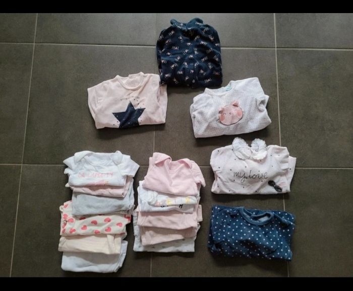 5 pyjamas, 13 bodies, 1 manteau, 3 robes, 2 grenouilles, 2 bas, 1 pull, 6 hauts, 3 gilets Tape à l œil obaibi la redoute kiabi
