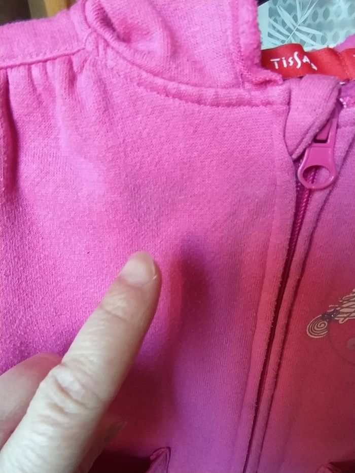 Sweat à capuche et fermeture éclair. Bon état, une petite tâche, très légère voir photo. 18 mois Tissaïa