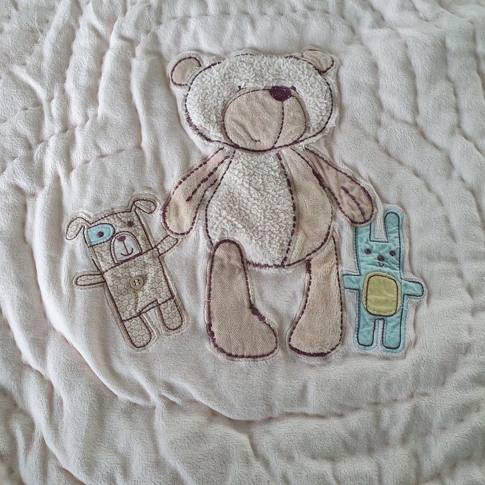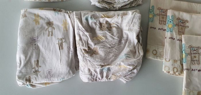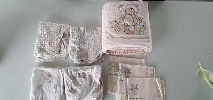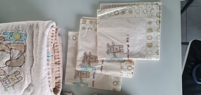 En Très bon état Le lot est composé de 4 draps housse pour lit bébé 3 taies d'oreiller 1 couverture réversible