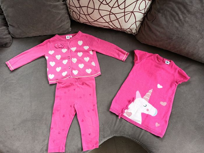 Plusieurs ensembles tailles 12 mois fille en très bon état : Une veste de marque cadet rousselle Ensemble la compagnie des petits comprenant une veste 12 mois et un legging taille 18 mois mais taille petit Ensemble de marque Z comprenant une veste, une robe et un legging Tout a été achetés neufs et uniquement portés par ma fille