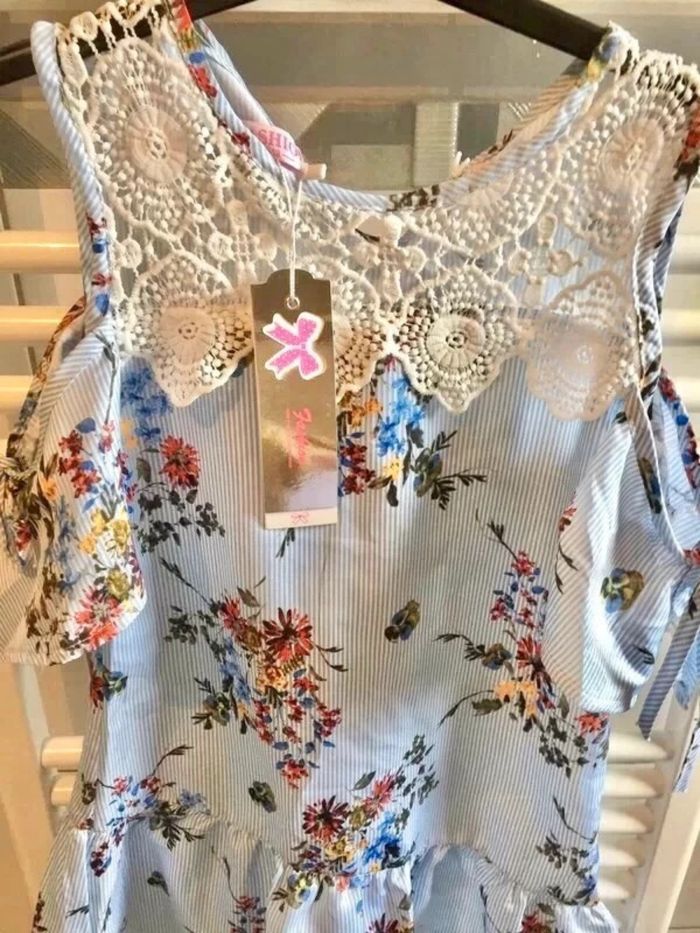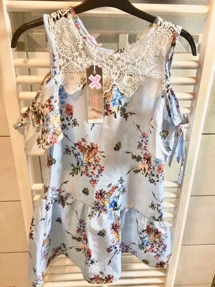 Robe Fashion bleu à rayures avec fleurs et broderies blanches,épaules dénudées et mancherons à lacer, neuve taille 12 ans à 12 euros