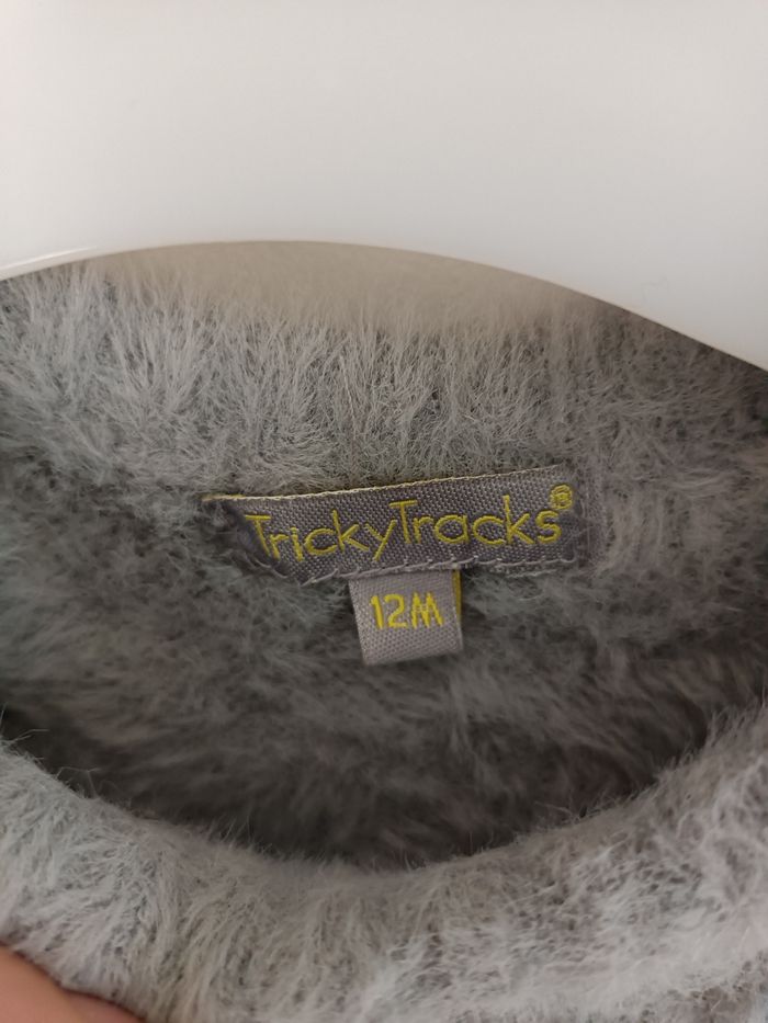 Pull gris très doux marque trickytracks Taille 12mois Très bon état (il manque juste 1bouton sur l'épaule. Possibilité de le recoudre car il y en a un en plus sur l'étiquette)
