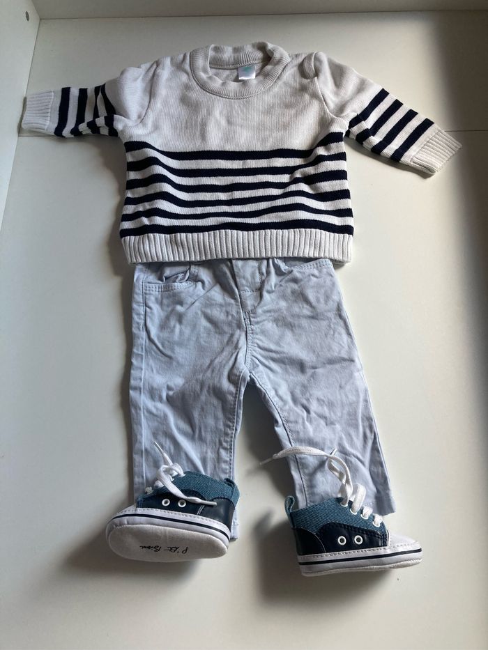 Tenue complète pantalon et pull marinière en 3 mois avec ses chaussures. Porté 1 fois