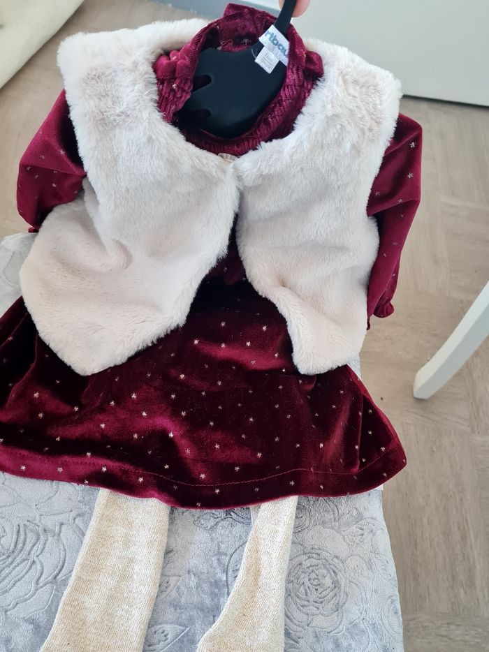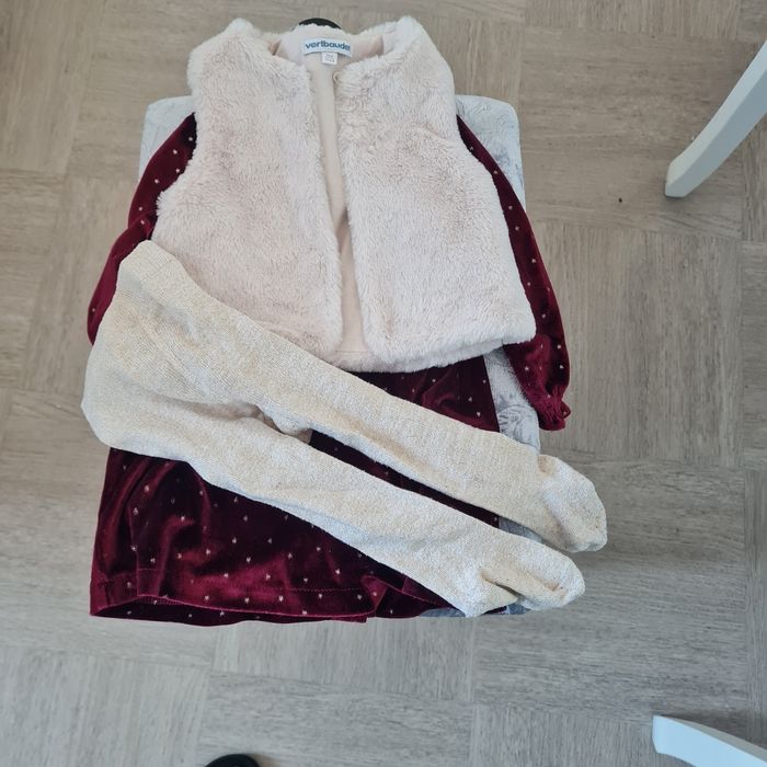 Presque neuf , Porté une seule fois , robe en velours ,gilet en fausse forrure , collants . Trés belle pour les anniversaires oû les fêtes 🥳