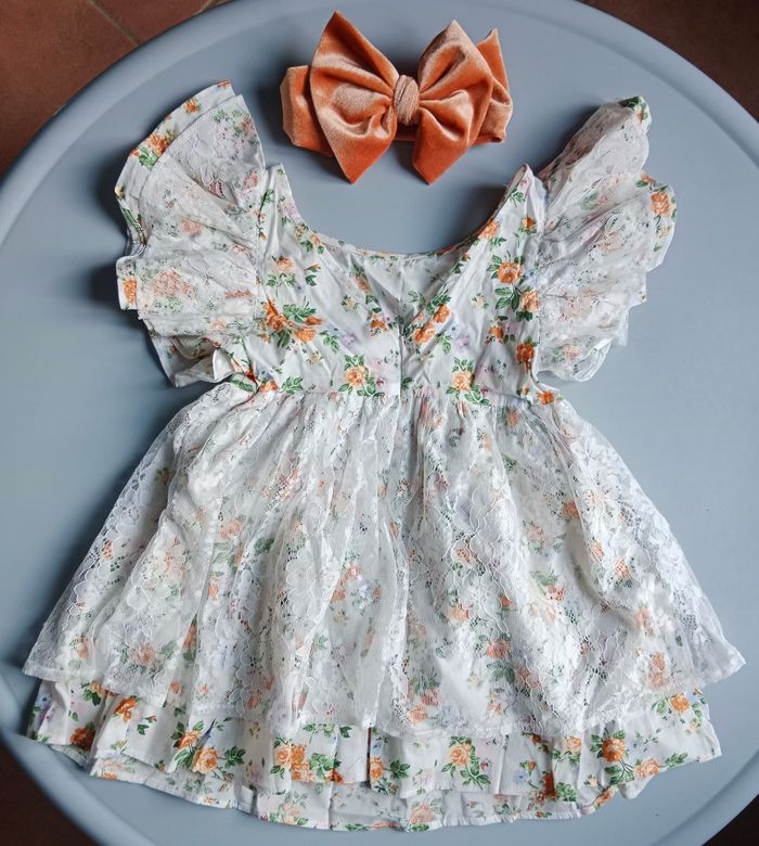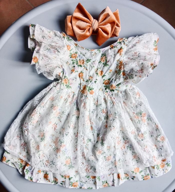 Ensemble robe fleurie à dentelle et bandeau cheveux gros noeud assorti