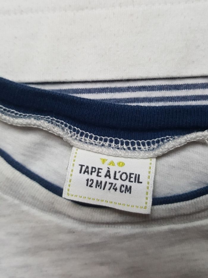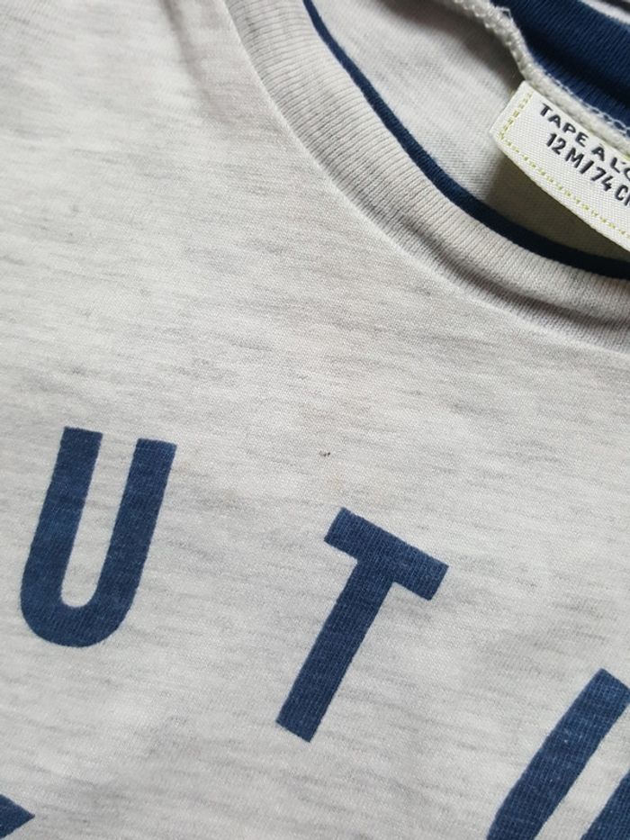 Lot de 3 t-shirts taille 12 mois. Beaucoup portés et bon état général mais une petite tâche sur le t-shirt gris voir dernière photo.