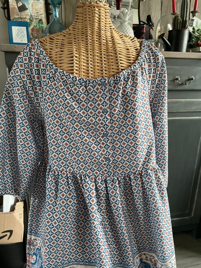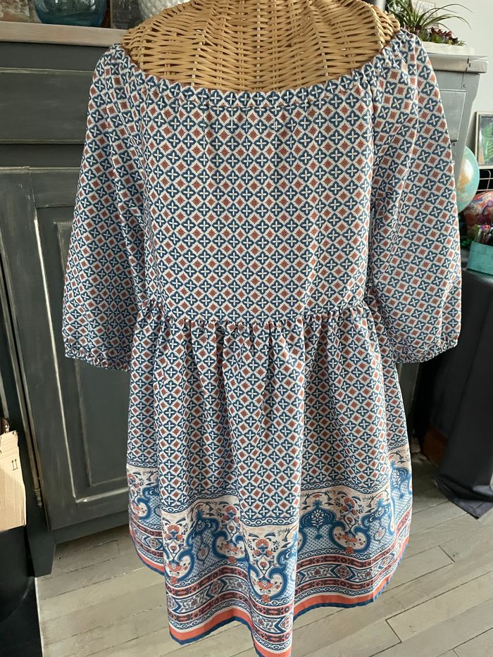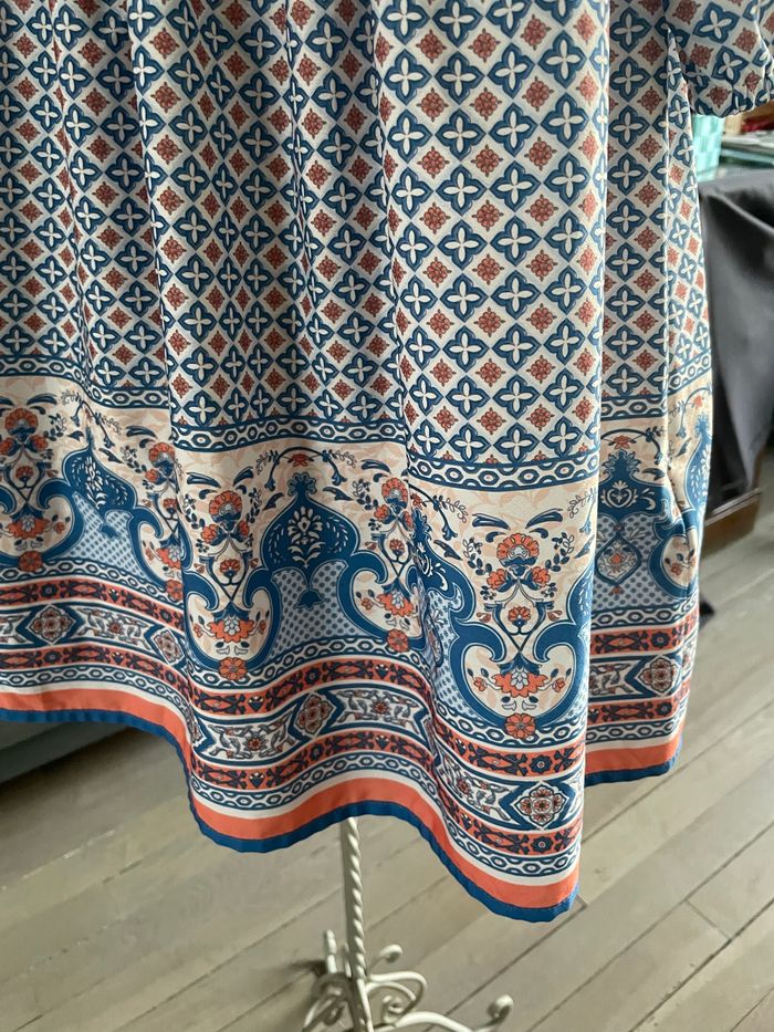 Robe hyper fluide aux couleurs douces corail et bleu. S’enfile rapidement. Elle se porte plutôt sur les épaules dégagées. Jamais portée Peu également se porter en blouse sur un pantalon.