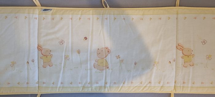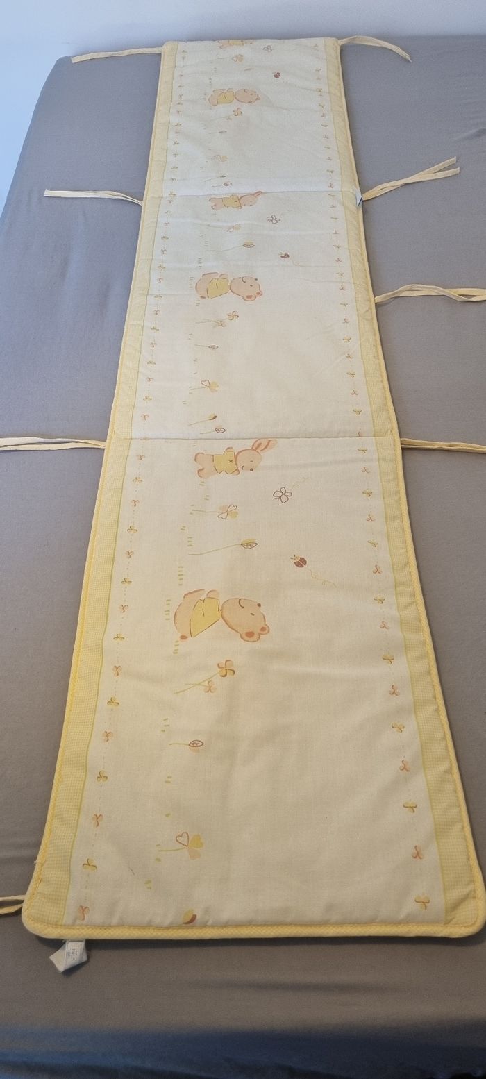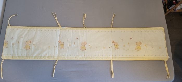 Tour de lit Dans les tons jaune clair Dimensions : 180 X 38 cm En bon état car manque un lien dans un coin