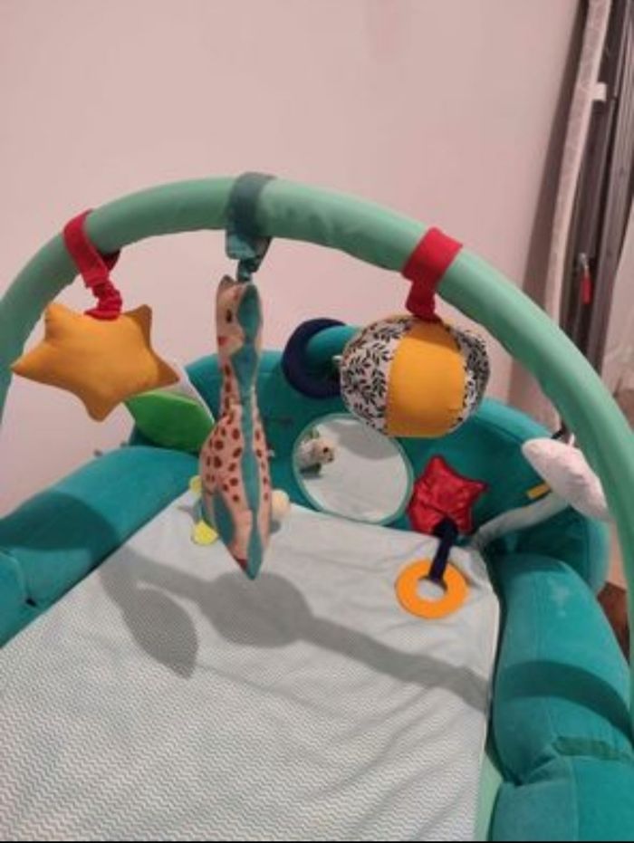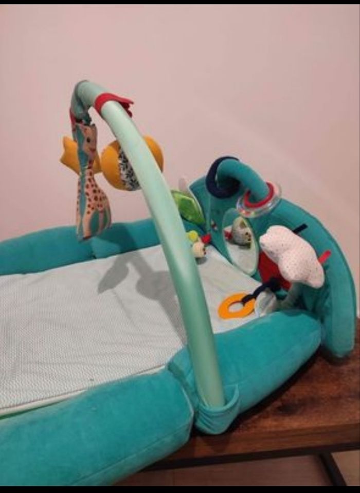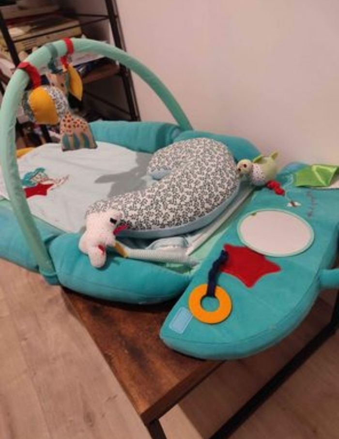 Grand coussin avec arche. Bébé peut se mettre sur le dos et profiter des jouets suspendu ou sur le ventre avec le petit coussin pour admirer son reflet et les jouets sur les côtés. Très pratique à emporter. Super bon état ! Prix neuf 70€.