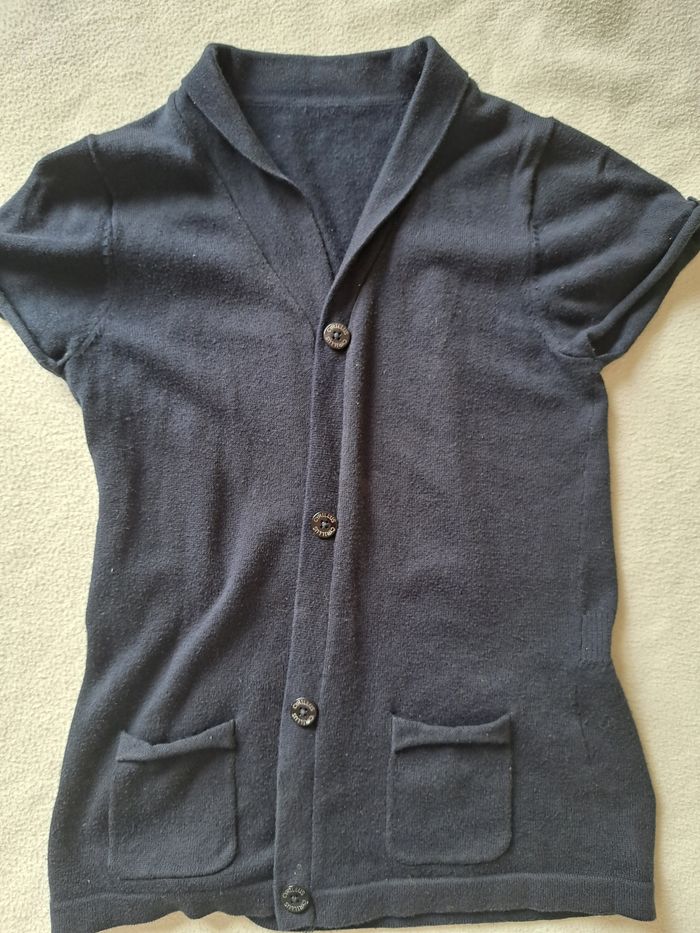 Gilet bleu marine manche courte avec 4 boutons. Porté par une petite fille très soigneuse. N'hésitez pas si vous désirez plus de photos.