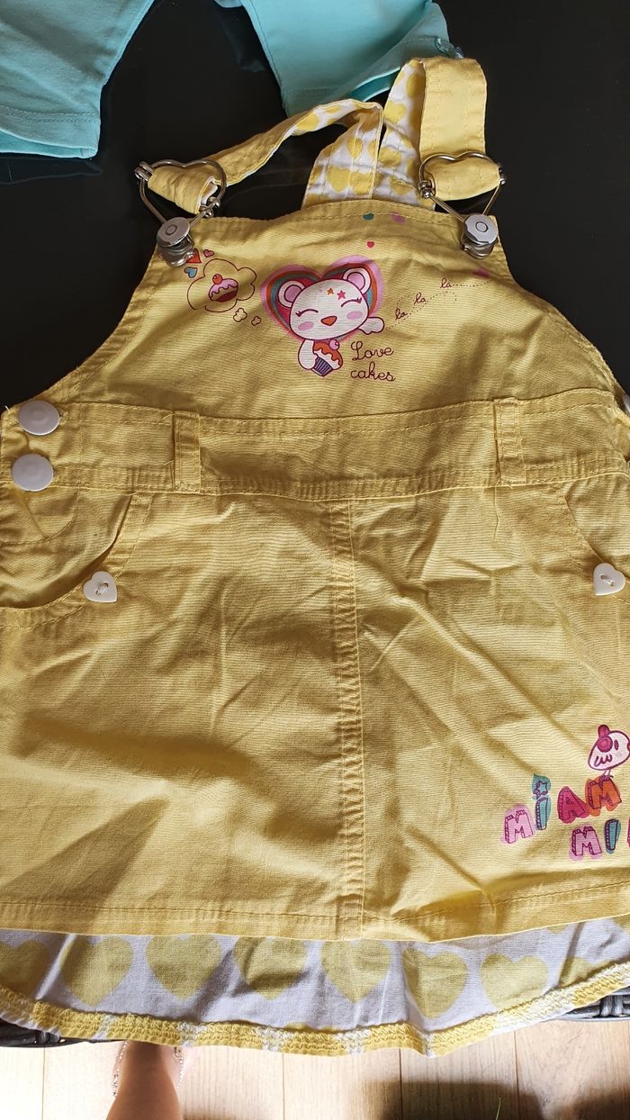 il comprend un short tao et un tee shirt blanc basique une combinaison été kiss melody blanche qui peut faire pyjama une robe couleur menthe et son legging h et m. un chemisier logg qui va bien avec un pantalon bleu graine de rêve un short jaune graine de rêve un ensemble jaune short et tee shirt taille 6 mois un bonnet avec une ficelle élastique taille 12 mois pour garder à la tête