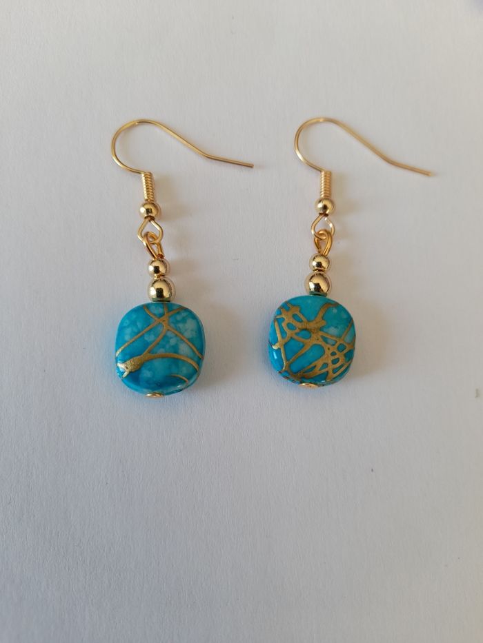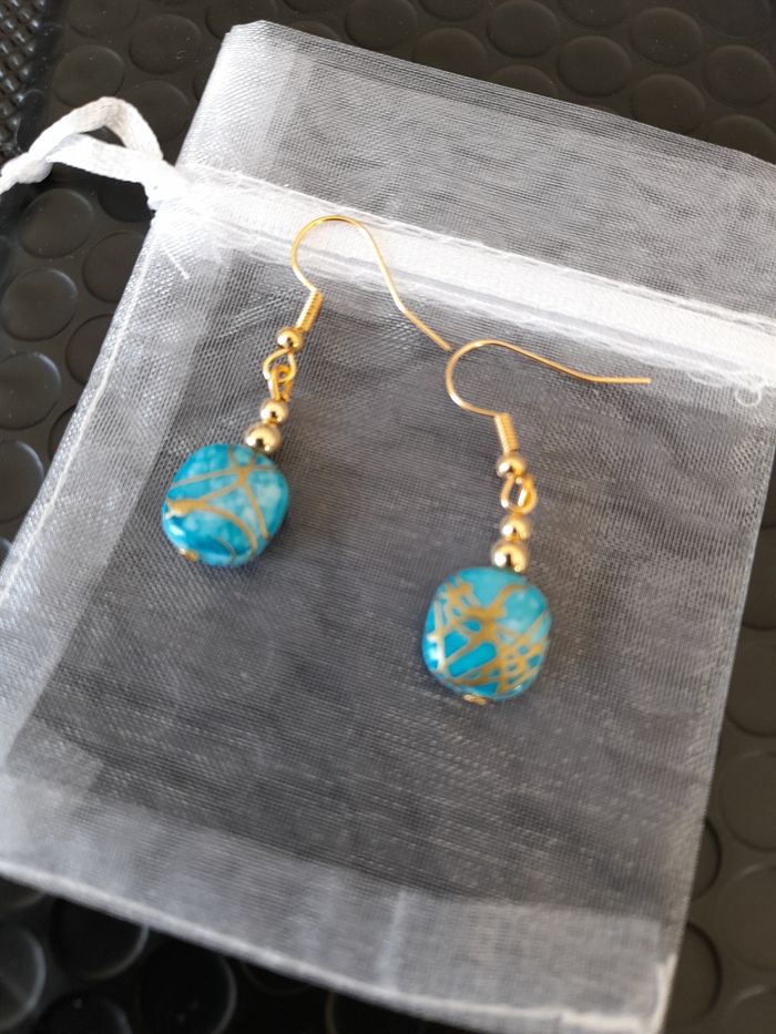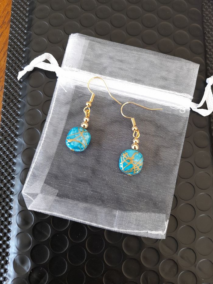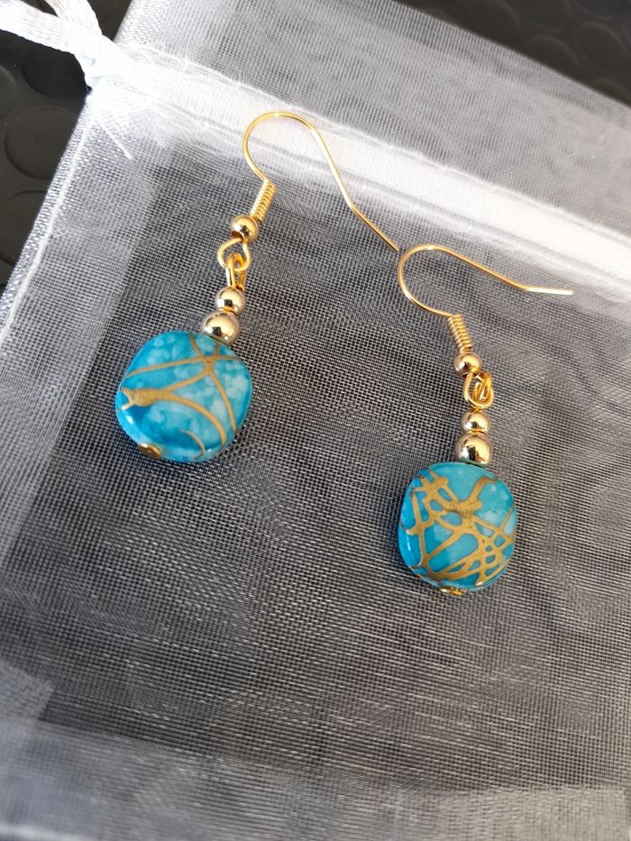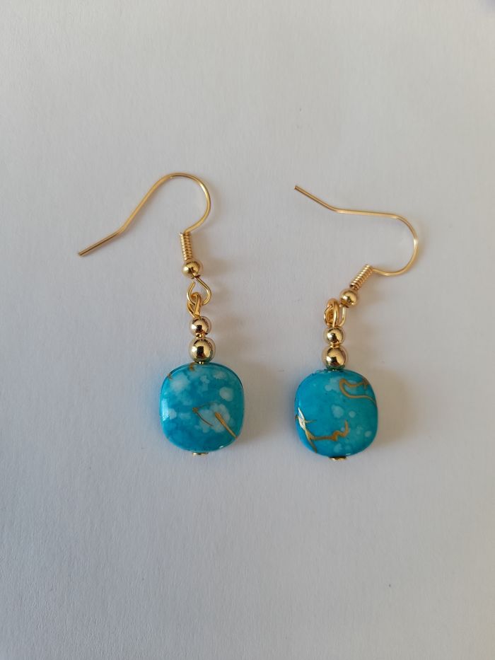Boucles d'oreilles ornés de perles bleu turquoise et doré en acrylique. 6 € la paire Fait main ✋ par mes soins N'hésitez pas à me contacter pour toute demande complémentaire ;)