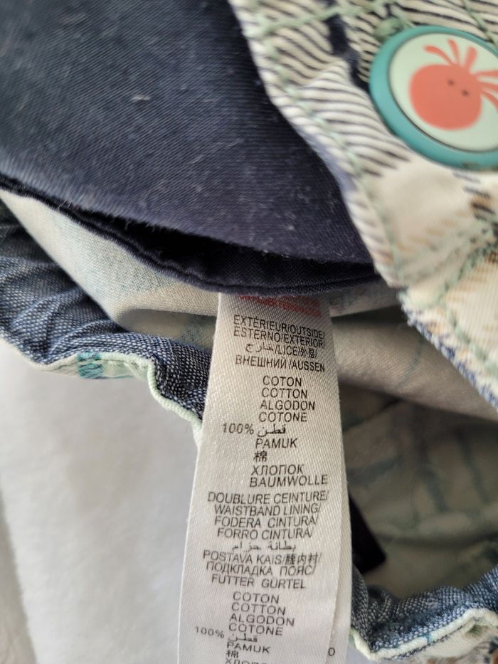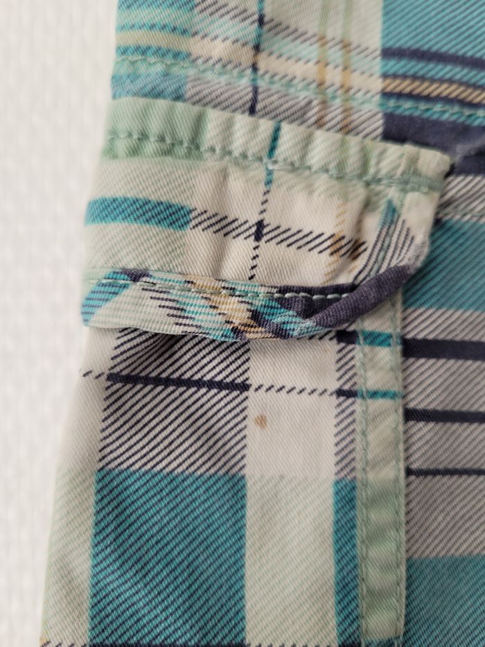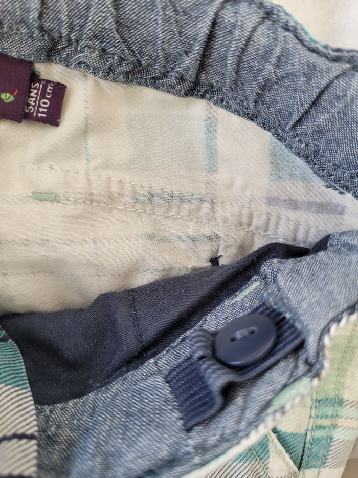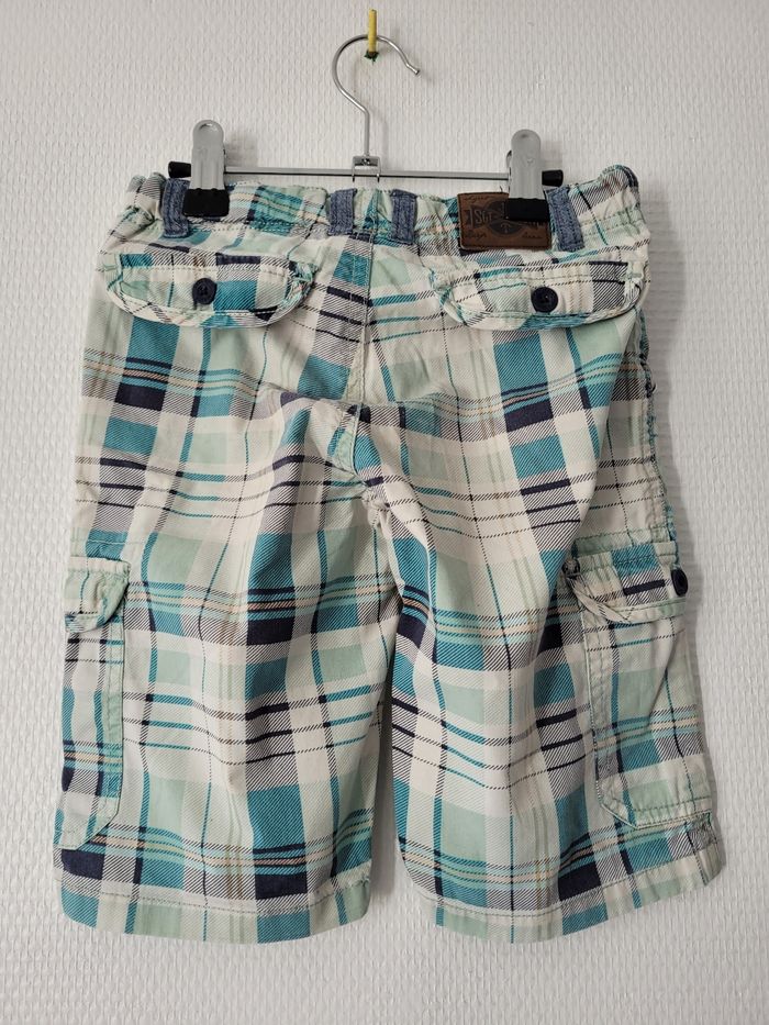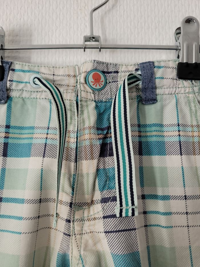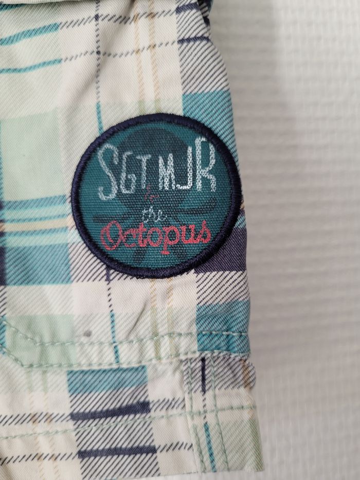 Bermuda cargo de marque Sergent Major taille 5 ans Find crème écossais bleu marine et vert Taille réglable Poches sur les côtés 100% coton En très bon état général mais une petite tâche sur chaque poche (cf photos)